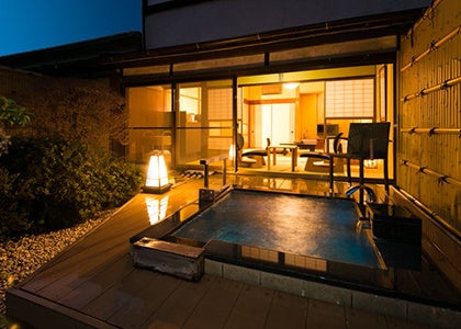 伊東緑涌は、プライベートな空間を大切にした「庭園露天風呂付き客室」です。お庭に面したお部屋で、屋根のない露天風呂は開放感があり、お庭の緑を眺めながら、また夜は月や星を眺めながらお好きな時に温泉を楽しむことができます。伊東小涌園の同敷地内にありますので、大浴場もご利用が可能です。