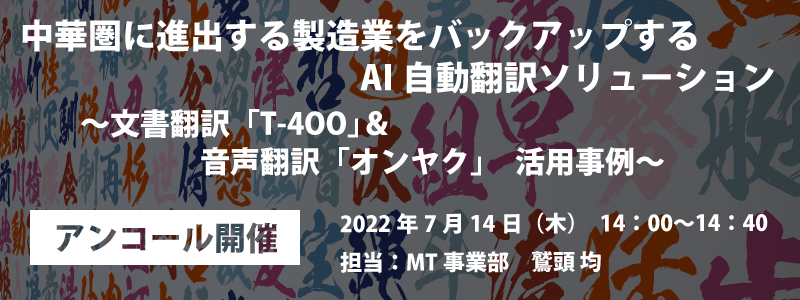 AI自動翻訳のロゼッタ ウェビナー『中華圏に進出する製造業をバックアップするAI自動翻訳ソリューション ~文書翻訳「T-4OO」&音声翻訳「オンヤク」活用事例~』7月14日(木) 開催
