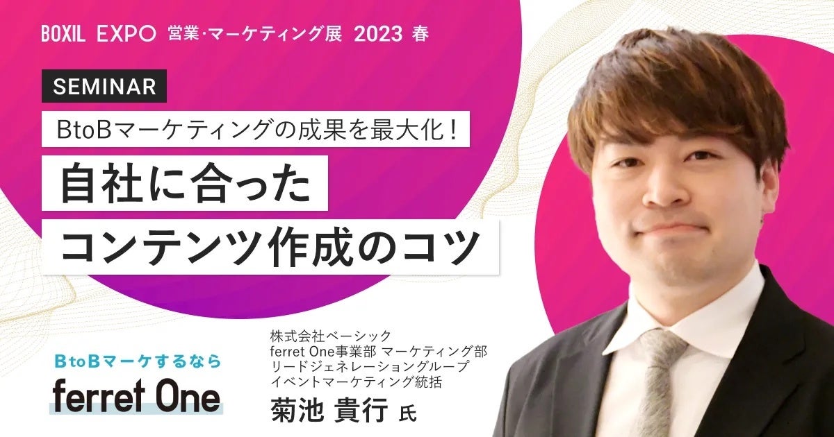 BtoBマーケティングのお困りごとをまるっと解決するサービス『ferret One(フェレットワン)』を運営する株式会社ベーシック(本社:東京都千代田区、代表取締役:秋山勝、以下「当社」)は2023年3月28日から30日にかけてスマートキャンプ株式会社(本社:東京都港区、代表取締役社長CEO:林詩音)が主催する「BOXIL EXPO 営業・マーケティング展 2023春」に出展することをお知らせいたします。