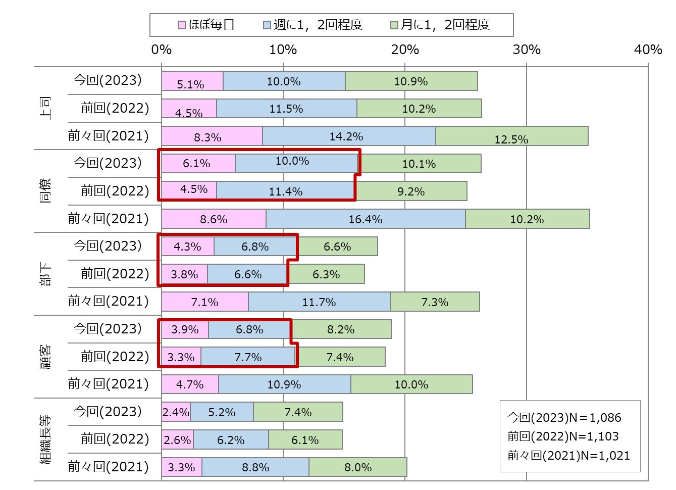 過去半年間において、顧客から就業時間外において業務に関して緊急性のない電話やメール(LINEなどを含む)があり、通話・返信などを週1回以上対応している人は、前回調査と比べて、0.3ポイント(11.0%→10.7%)とやや減少しており、同僚とのやりとりにおいては0.2ポイント(15.9%→16.1%)、部下とのやりとりにおいては0.7ポイント(10.4%→11.1%)の増加となっており、就業時間外に業務上の対応をしたことがある人の割合は横ばいとなっています。月1回以上就業時間外に業務上の対応をしたことがある人は2021年度では3~5人に1人、2022、2023年度には4~6人に1人となっており、つながらない権利は22年度にかけて大きく進展したものの、その後あまり進展していないと想定されます。(図4)