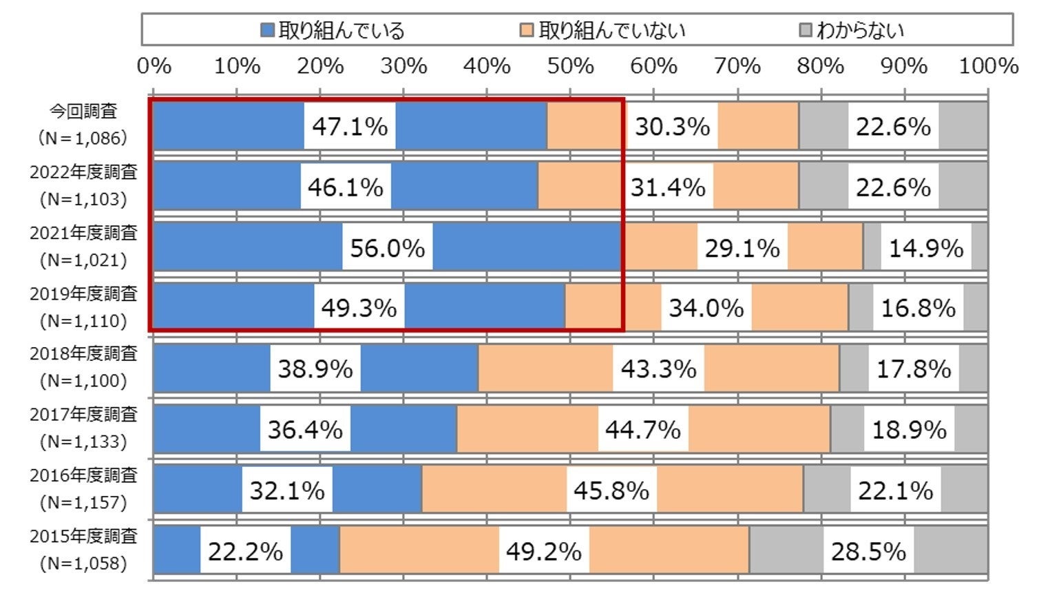 働き方改革に取り組む企業は全体の47.1%となり、前回調査の46.1%より1ポイント増加しましたが、前々回(2021年度)調査の56.0%を下回る結果となりました。これは直近4回の調査では、2022年に次いで低い結果となっており(2019年度:49.3%、2021年度:56.0%)、コロナ禍を経て企業の働き方改革への新たな取り組みが2019、2021年と比較すると停滞していることが読み取れます。(図1)