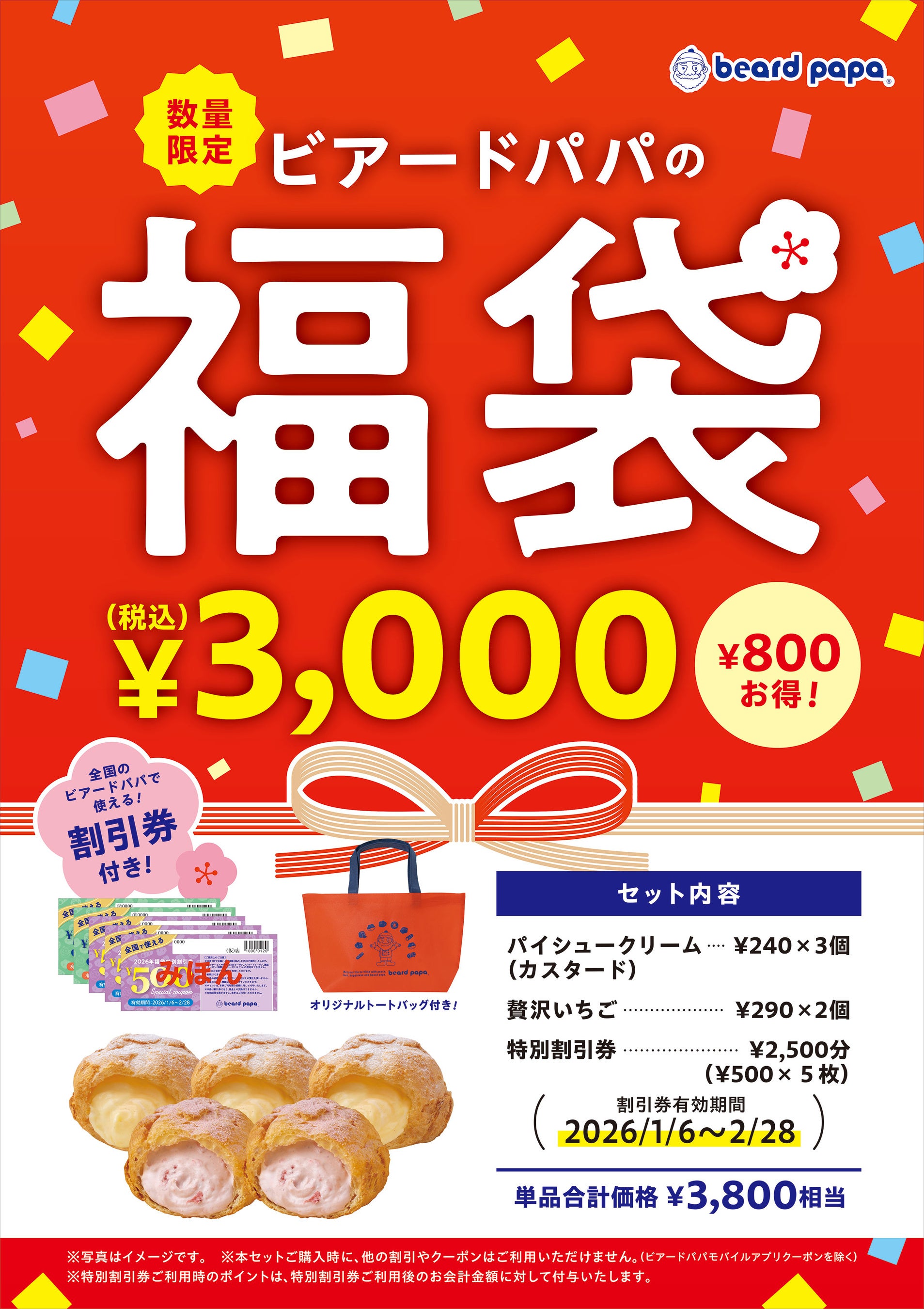 新春恒例の“ビアードパパの福袋2026”は、オリジナルトートバッグに特別割引券2,500円分(500円×5枚)と王道の“パイシュークリーム(カスタード)”3個、期間限定シュークリームの“贅沢いちご”2個が入った合計3,800円相当のセットを、3,000円(税込)でご提供いたします。さらに、福袋購入時はビアードパパモバイルアプリポイントも付与されますので、よりお得にご利用いただけます。