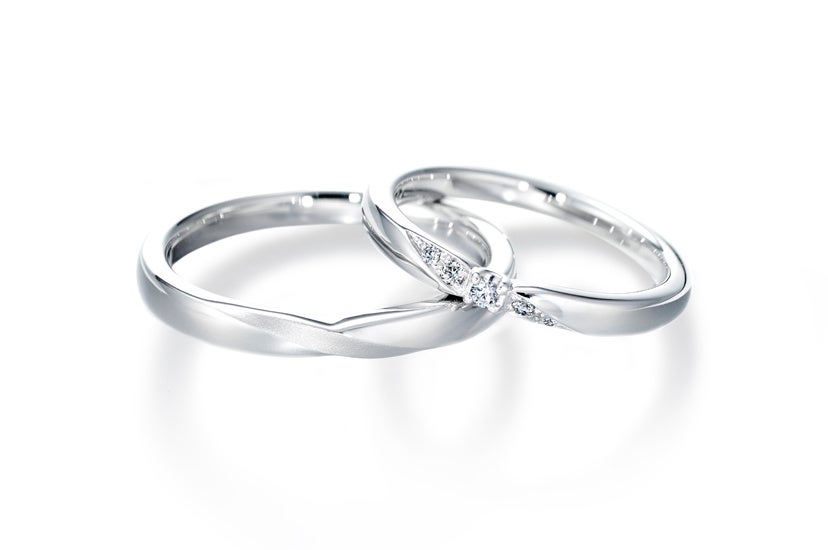 真ん中のメレダイヤモンドの石座は、幸せを受け止める幸せのモチーフであるホースシューをイメージしています。ペアのリングには、マット加工を施しています。
