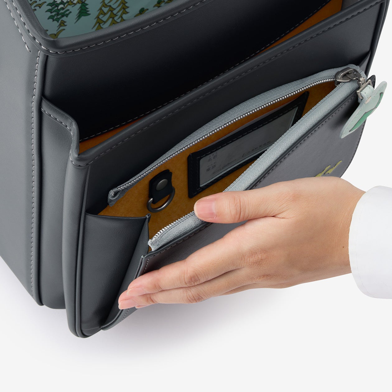 大きく開いてハンカチやティッシュ、ランドセルの雨カバーなども入れやすく、手に触れても痛くないファスナーを採用。鍵用の金具と名前カードはポケットの内側に隠すことができます。