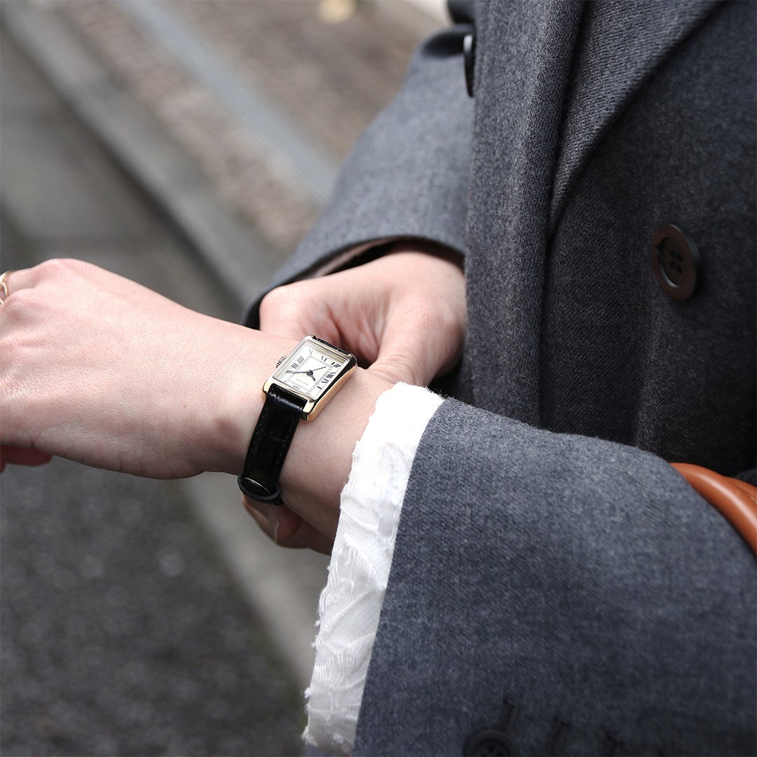 アイボリーの文字盤には、伝統的なローマンインデックスのデザインをチョイス。ケースに合わせた長方形型のレールウェイ(※)の外側に、角度を合わせたローマ数字を這わせることで、より時刻が読みやすくなっています。イエローゴールドが年月をかけて退色したようなシャンパンゴールドが、ヴィンテージ感もあるけど、どこか今っぽい。