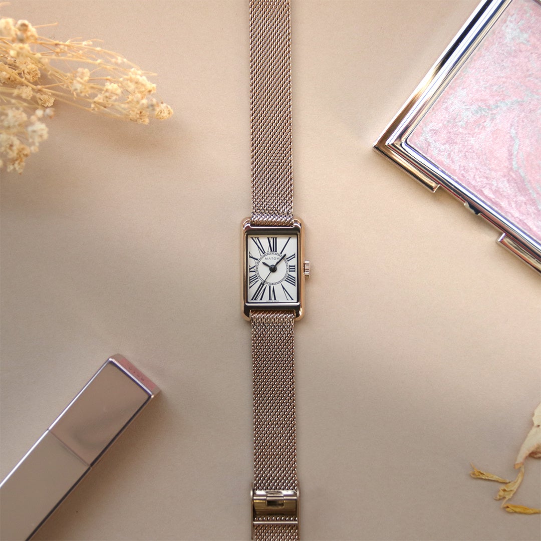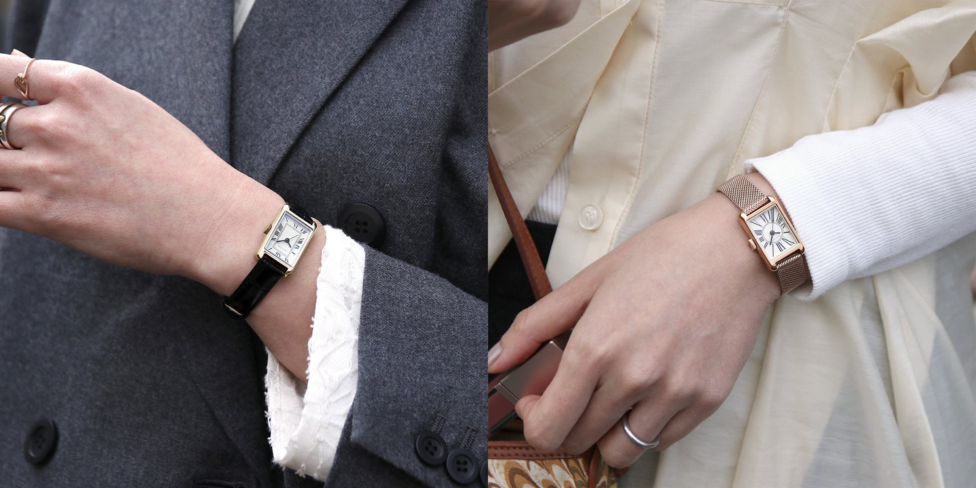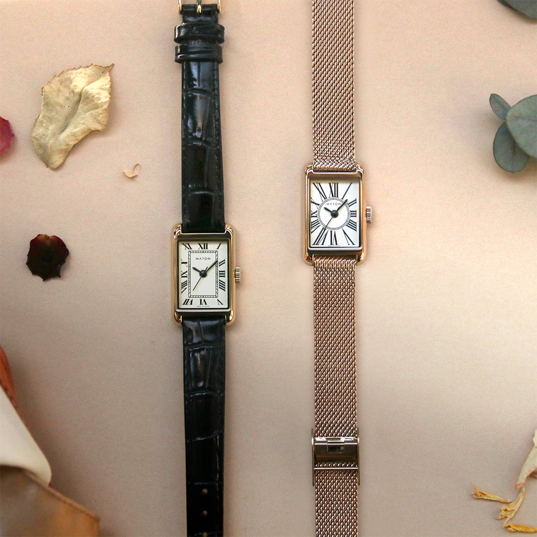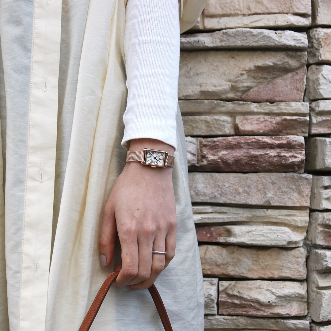 今回TiCTACが別注した2つのモデルは、ピンクゴールドのケースとメッシュバンドで華やかな印象の「朧月/サークルローマン mw004011」と、シャンパンゴールドのケースにブラックのレザーを組み合わせた大人なデザインの「朧月/レクタンギュラーローマン mw004012」。似たようで少し違うローマンインデックスを用いた文字盤デザインが、まるで70年代のドレスウォッチかのような、エレガントで繊細な美しさを表現しています。