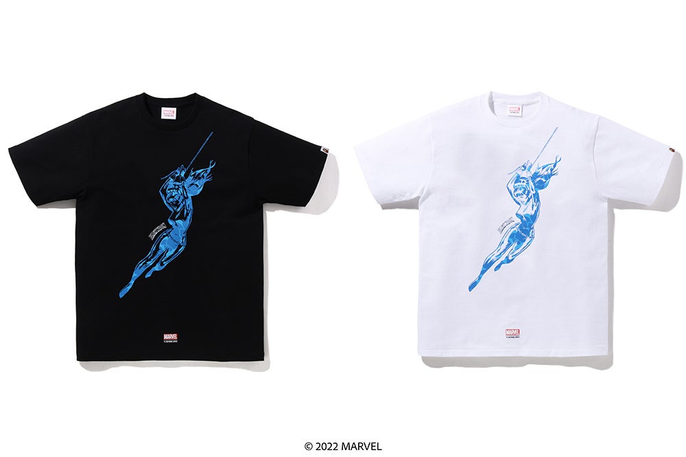 同時リリースとなるTシャツのグラフィックは、キャラクターのアイコニックなシルエットにBAPE®︎ CAMOを投影。また、ボディの下部と首裏のタグには、両者の長きにわたるリレーションシップの象徴としてBAPE®︎とMARVELのダブルネームロゴを配置しています。