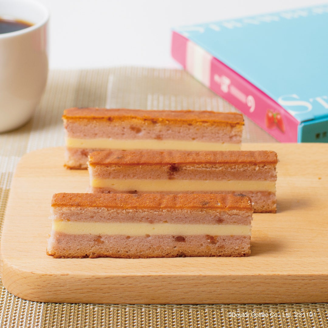 カステラにいちご濃縮果汁といちごのフリーズドライを練り込むことで、いちごの香りと甘酸っぱさが楽しめる仕立てに。まろやかなマスカルポーネチーズフィリングをサンドした、スティックタイプのチーズケーキです。