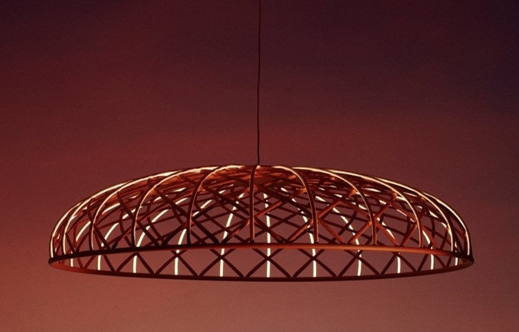“シェード自体を光源にする”という視点の転換により生み出されたペンダント照明。中央に電球やモジュールは存在せず、中央から放射状に並ぶ、LEDと一体化した24本のテキスタイルチューブが発光します。チューブは照明器具の構造に沿い糸のように織り込まれ、電球を使用した従来の照明器具の常識を覆す、独創的なデザインと機能を併せ持ちます。光を効率よく広げるドーム型のペンダントは、アートのような雰囲気で、空間をドラマチックに演出します。