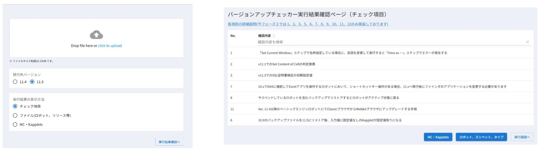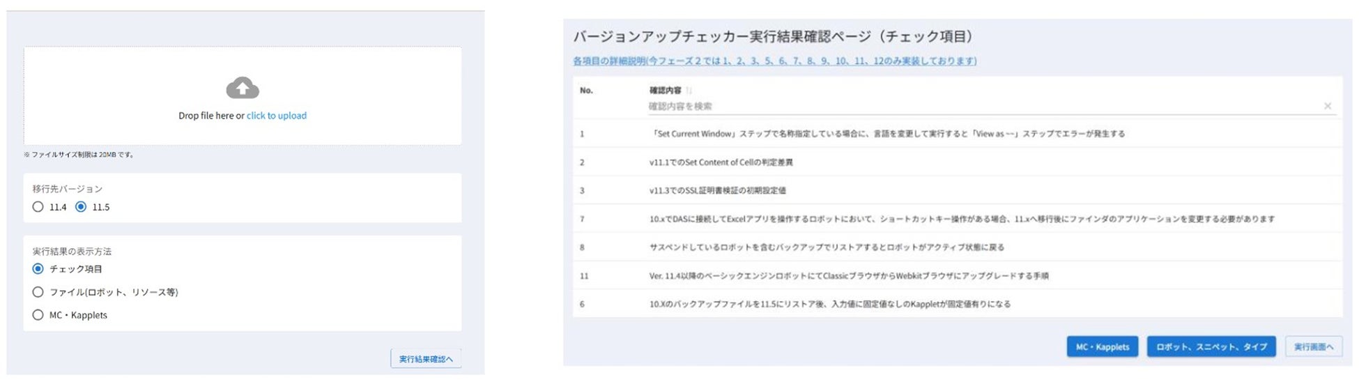 また「バージョンアップチェッカー」は、ユーザーによる確認が必要な注意事項※2に関して、対象となるMC(Management Console)ファイルや、Kappletsのバックアップファイルをアップロードするための専用フォームです。このフォームに対象ファイルをアップロードすると、バージョンアップの影響がどの範囲に及ぶのか、具体的に何を確認する必要があるのか等の情報をブラウザ上に一覧表示します。