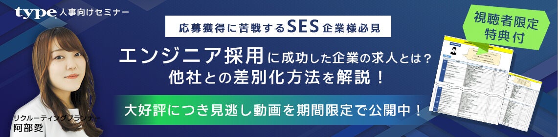 2022年4月に開催いたしました、「【応募獲得に苦戦するSES企業様必見】エンジニア採用に成功した企業の求人とは?他社と差別化する方法を解説!」セミナーが大変ご好評いただきましたため、期間限定で当日の動画を公開いたします。