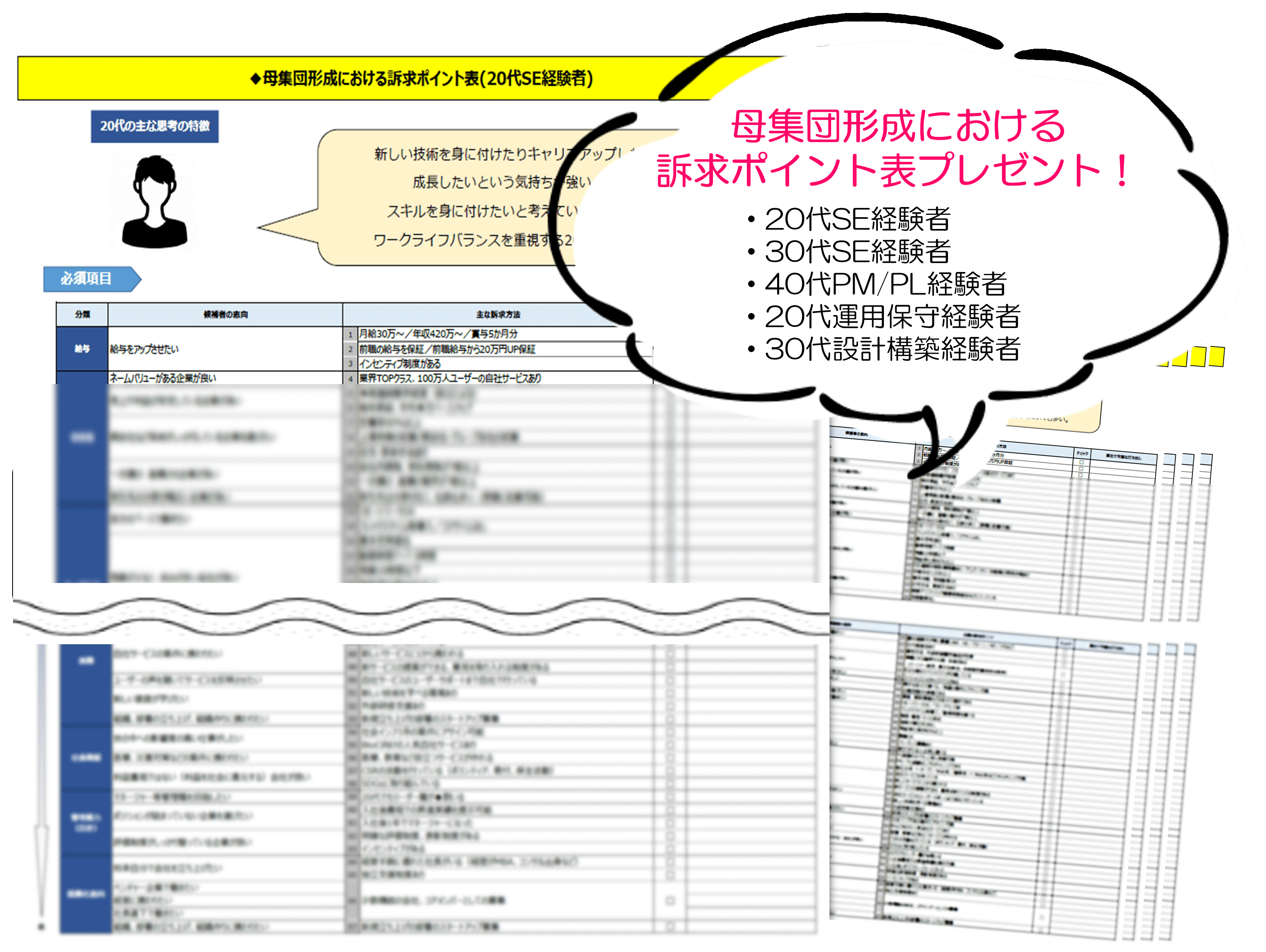年齢層×経験業務ごとに5パターンのターゲットを想定。シートの項目にチェックをつけるだけで、自社の訴求すべきポイントがわかります。ご視聴後、アンケートにご回答いただいた企業様限定でプレゼントいたします。