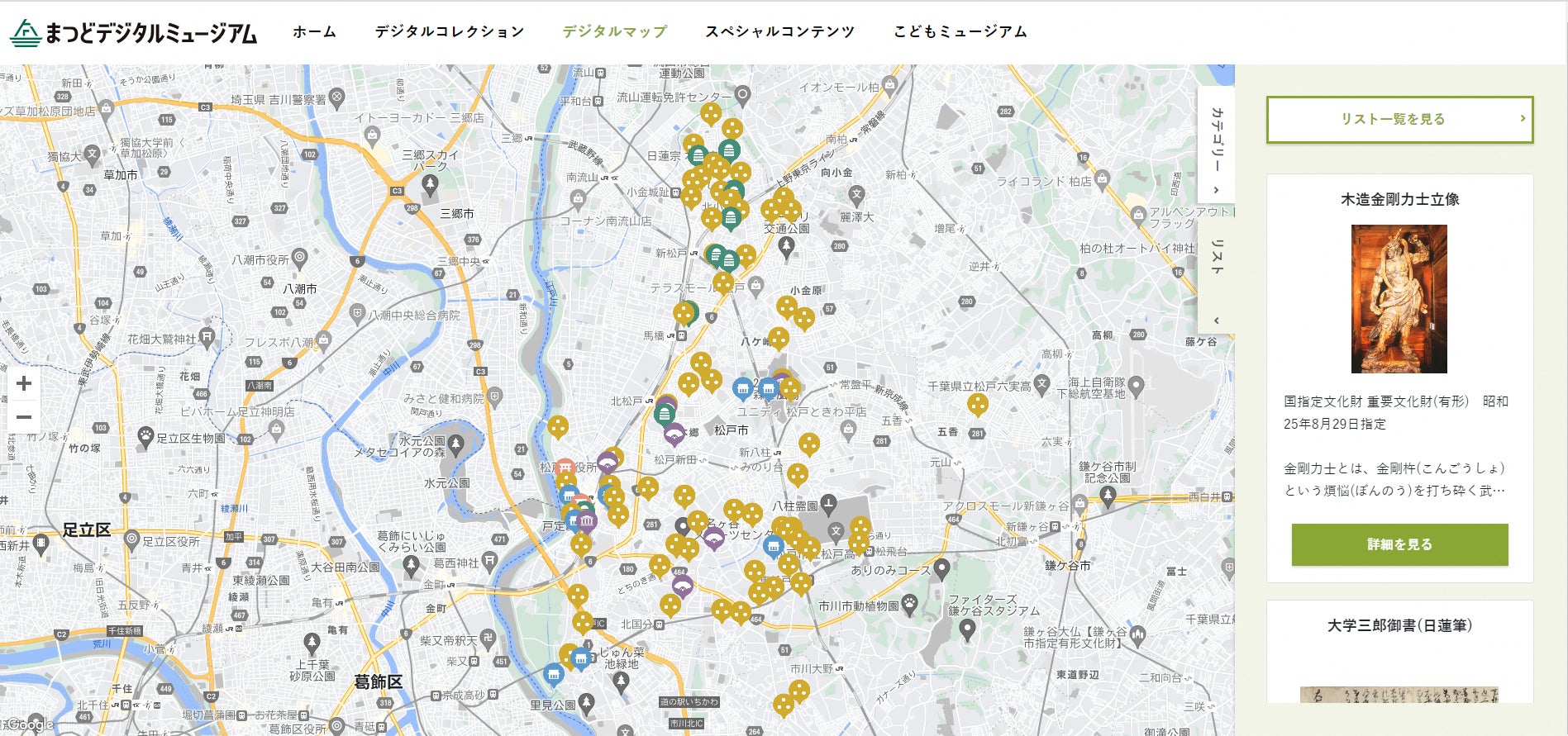 松戸市内の文化財や遺跡などの位置を地図上にポイントとして表示し、クリックすると詳細を見ることができます。