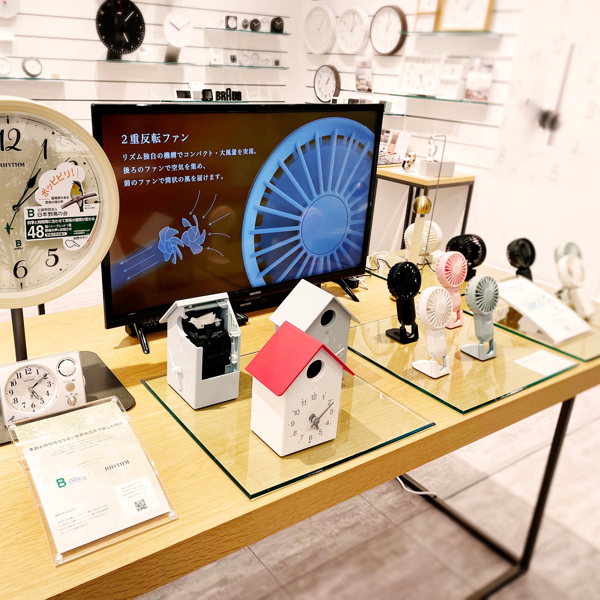 「ふいご機構」を用いたカッコークロックを中心に、 「2重反転ファン」を用いたハンディファンなどの季節商材や特徴商品、 壁掛け時計・置き時計・腕時計と、 これからの新生活を彩る素敵なアイテムを豊富に取り揃えました。