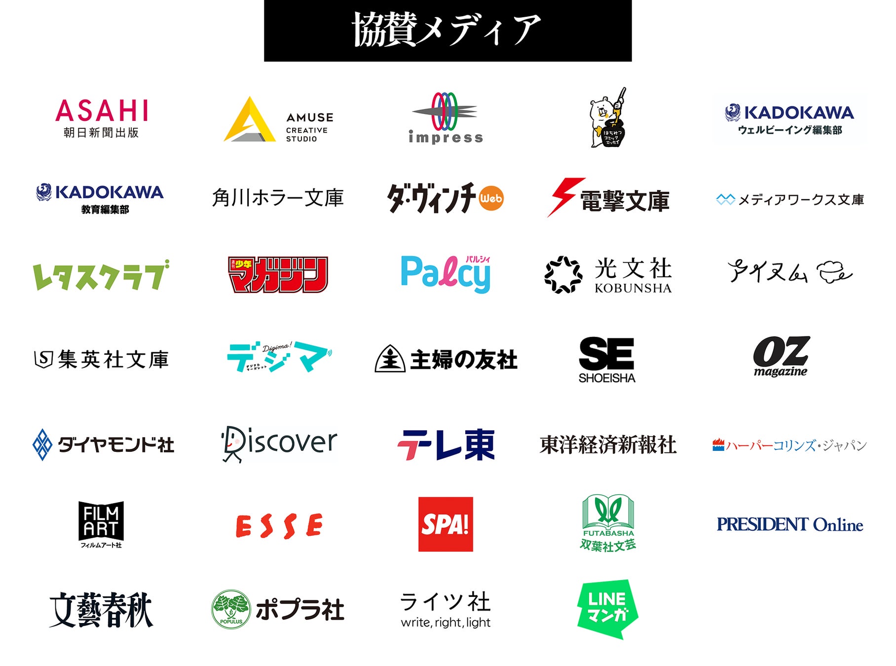 朝日新聞出版、アミューズクリエイティブスタジオ、インプレス、はちみつコミックエッセイ(オーバーラップ)、KADOKAWAウェルビーイング編集部、KADOKAWA教育編集部、角川ホラー文庫(KADOKAWA)、ダ・ヴィンチWeb(KADOKAWA)、電撃文庫(KADOKAWA)、メディアワークス文庫(KADOKAWA)、レタスクラブ(KADOKAWA LifeDesign)、週刊少年マガジン編集部(講談社)、Palcy(講談社)、光文社、アイスム(サクシード)、集英社文庫(集英社)、デジタルマーガレット編集部(集英社)、主婦の友社、翔泳社、OZmagazine/OZcomics/OZbooks(スターツ出版)、ダイヤモンド社、ディスカヴァー・トゥエンティワン、テレビ東京、東洋経済新報社、ハーパーコリンズ・ジャパン、フィルムアート社、ESSE(扶桑社)、SPA!(扶桑社)、双葉社文芸出版部、プレジデントオンライン(プレジデント社)、文藝春秋、ポプラ社一般書編集部、ライツ社、LINEマンガ(LINE Digital Frontier)