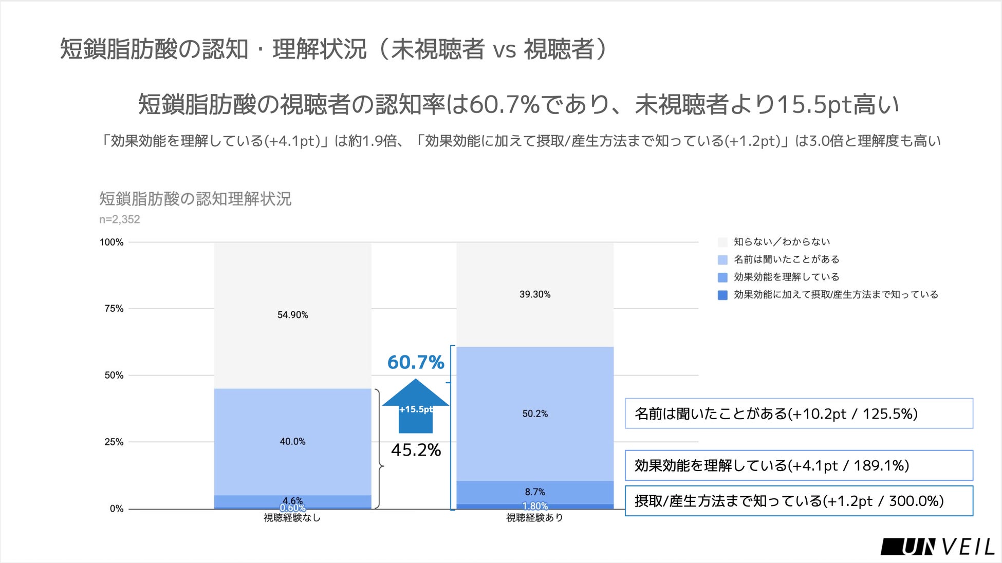 アンベールによる3ヶ月間の情報配信の結果、短鎖脂肪酸の「認知度」および「理解度」の双方において顕著な向上が認められました。特に成分の効果効能に対する理解度は約1.9倍となり、さらに体内への摂取および産生方法についても非視聴者に対して3倍の数値となりました。