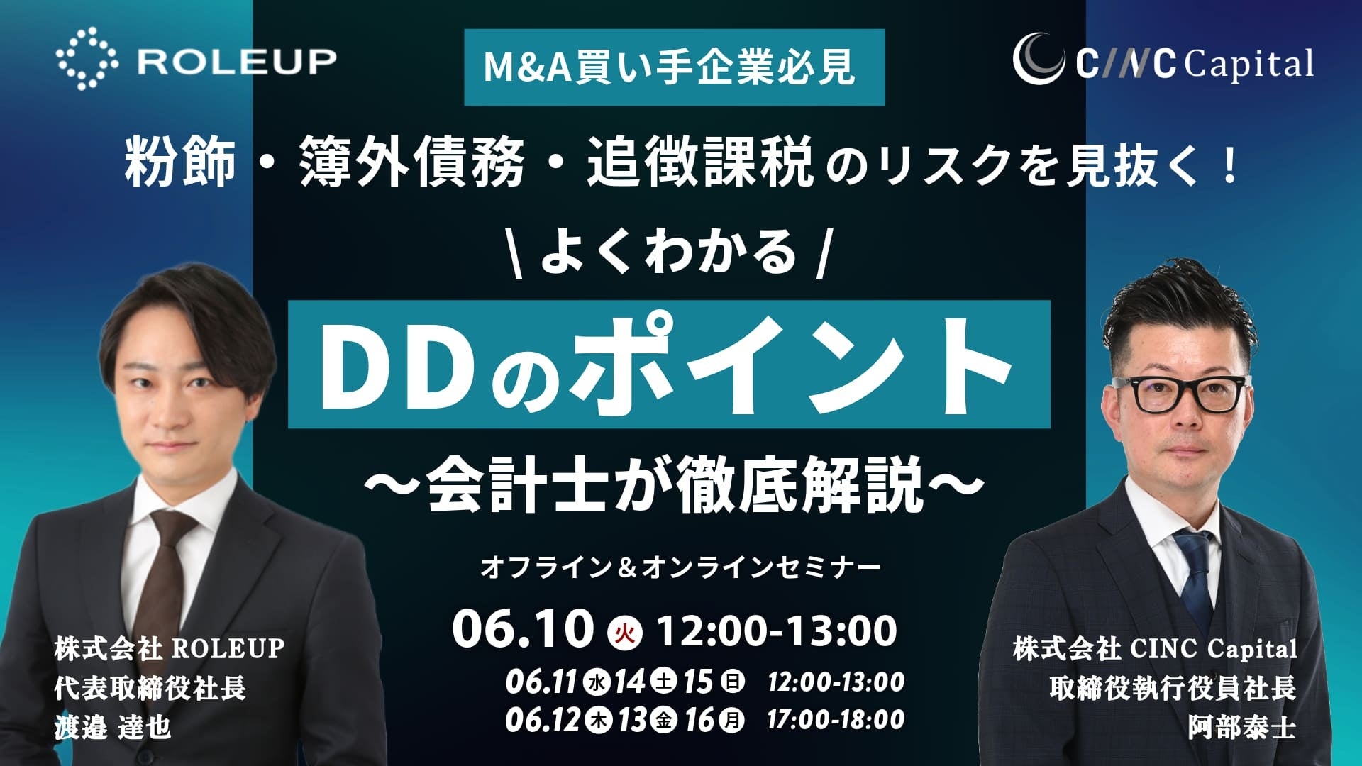 本セミナーでは、数多くのDD実務を支援してきた株式会社ROLEUPの代表をお招きし、「なぜDDが必要なのか(目的と重要性)」「買い手として押さえるべきポイント」「実際に起きた失敗・成功のケーススタディ」について解説していただきます。