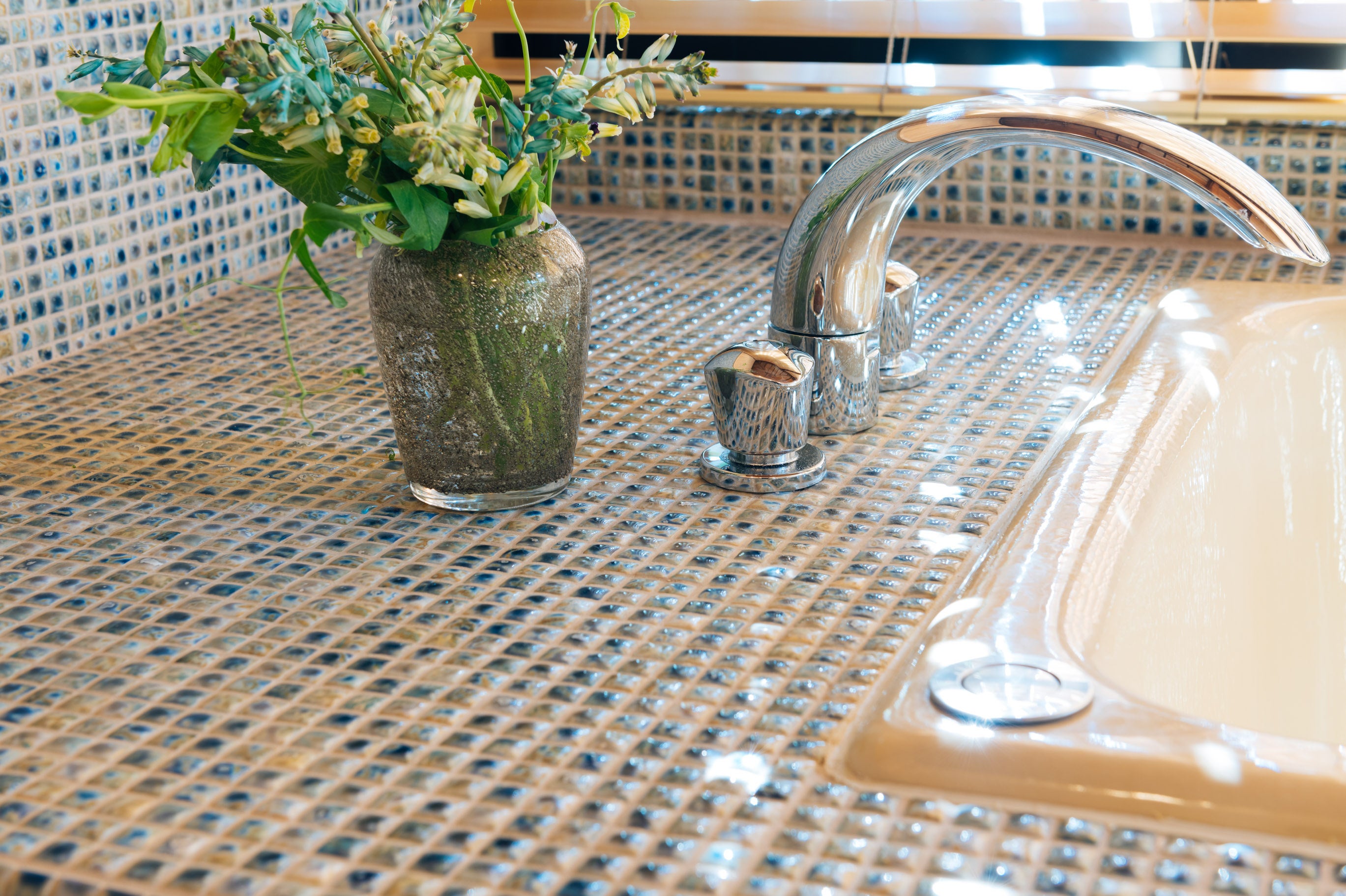 洗練されたデザインのダイニングテーブルの素材にはサステナブルなヒノキの間伐材を使用。壁やタイルが彩る黄金色と青が、鮮やかなコントラストを生み出します。