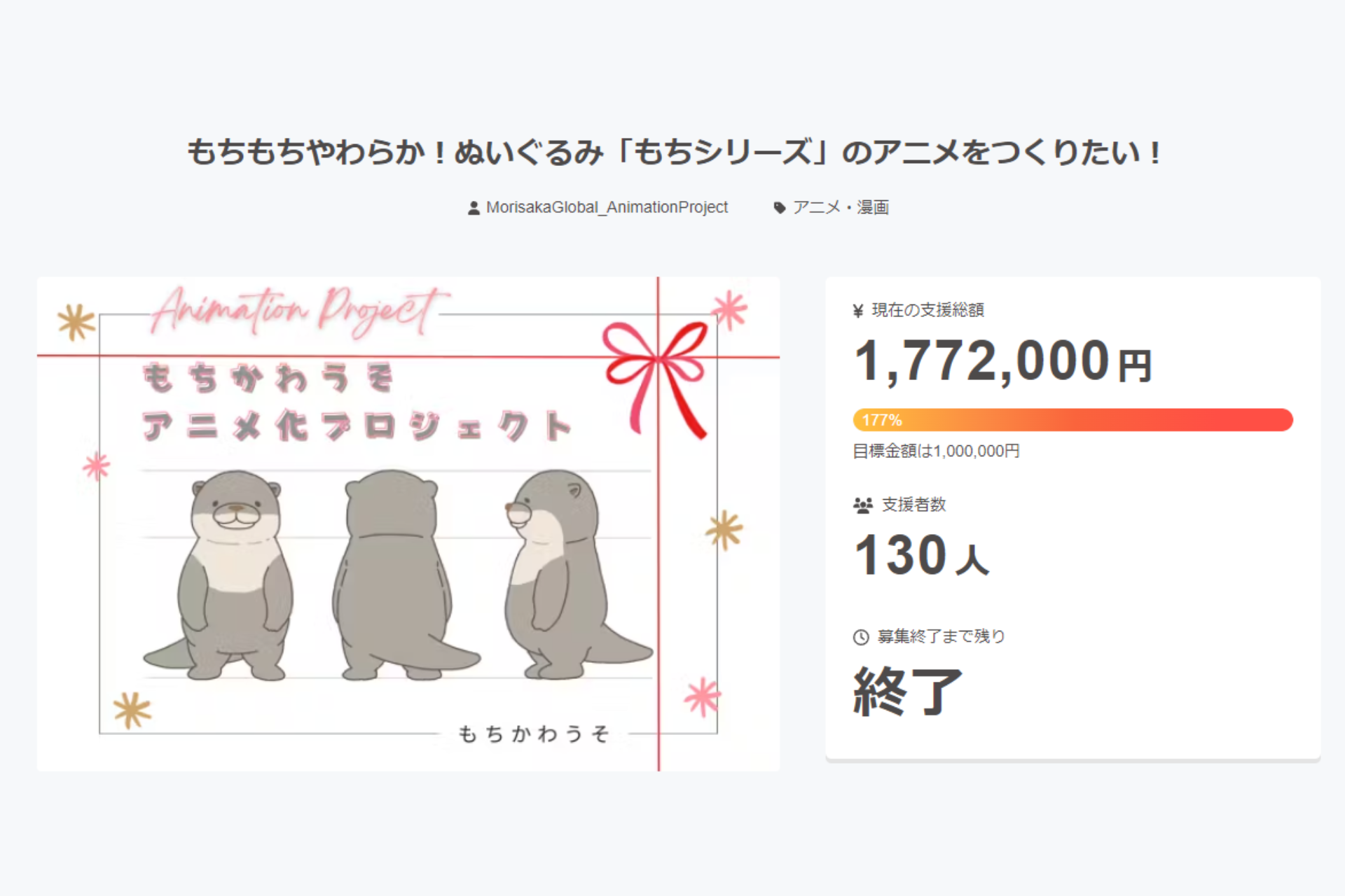 ぬいぐるみ『もちシリーズ』アニメ化プロジェクトが目標金額500万円を突破!ZenPromoが成功をサポート