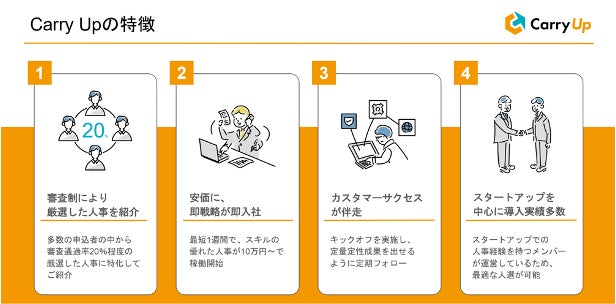 ユナイテッド・リクルートメント株式会社が運営する「Carry Up( https://company.carry-up.com/lp2 )」とは、企業とプロ人事の間でマッチングサポートをするサービスです。IT企業に特化しており、即戦力かつミスマッチの少ない人材をご提案します。ご利用企業は、現状お抱えの課題ヒアリング後、業務委託もしくは正社員の人事人材の提案、面接を経て決定し、最短1週間でプロ人事を採用することが可能です。