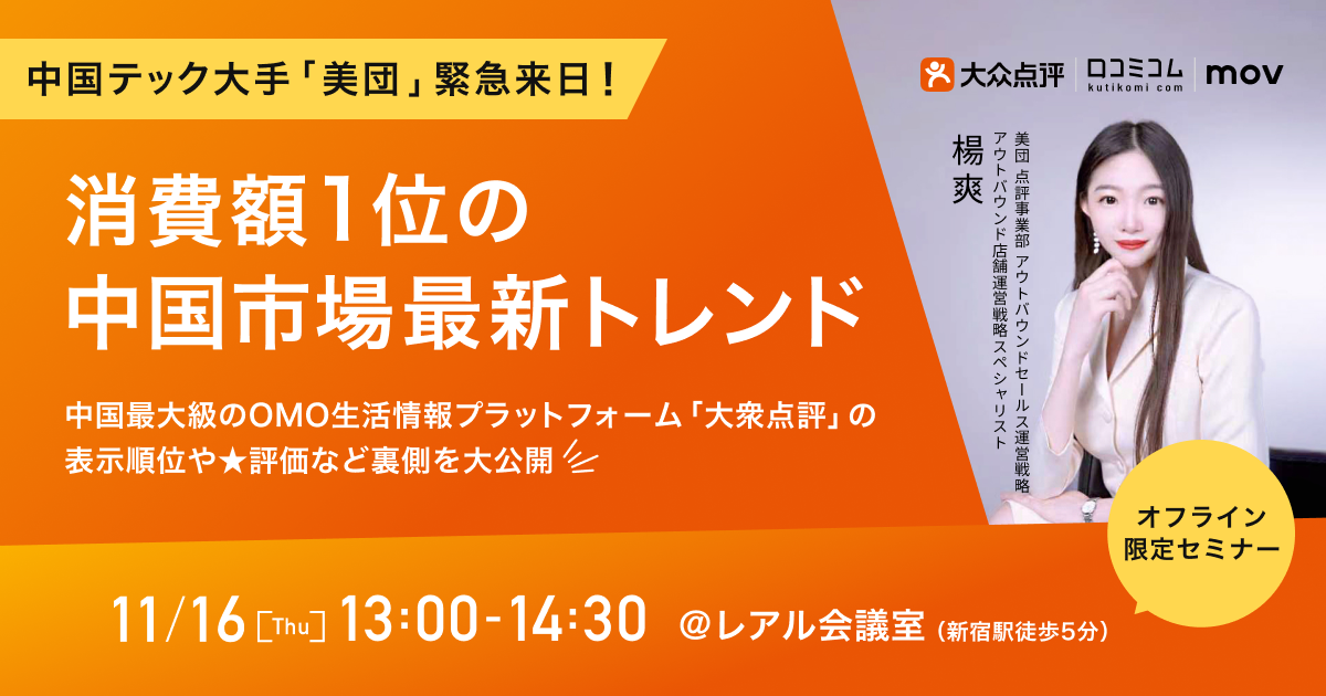 【消費額1位の中国市場】最新トレンド「美団」担当者が緊急来日!中国最大級のOMO⽣活情報プラットフォーム「大衆点評」の表示順位や★評価など裏側を大公開【11/16(木)参加無料】