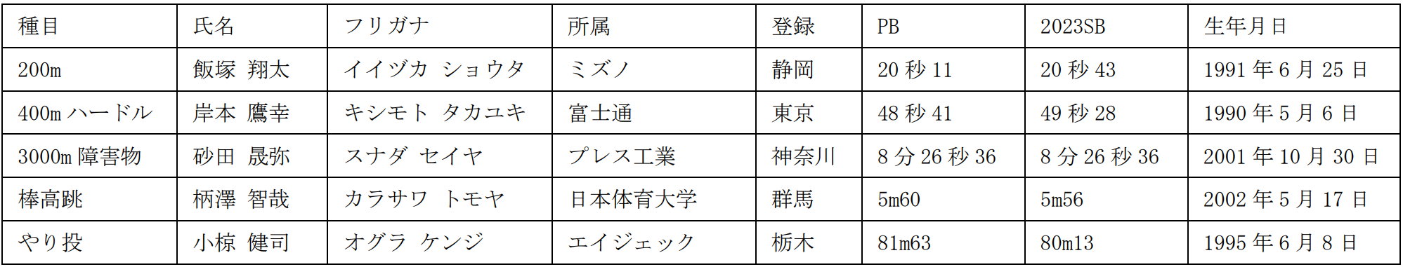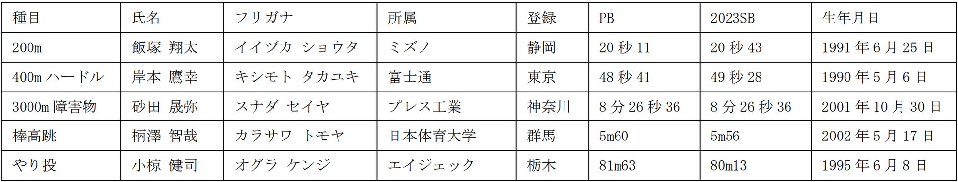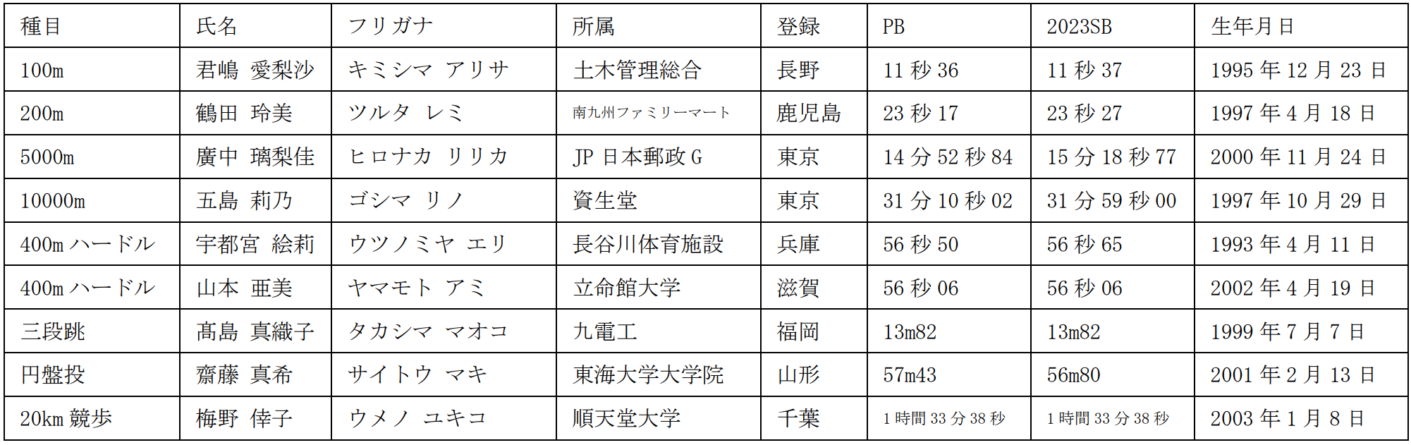 2023年8月19日(土)~27日(日)に開催される「ブダペスト2023世界陸上競技選手権大会」に派遣する日本代表選手につきまして、ワールドアスレティックスによる出場資格者の追加を受け、新たに 以下の選手が日本代表に決定しましたことをお知らせいたします。