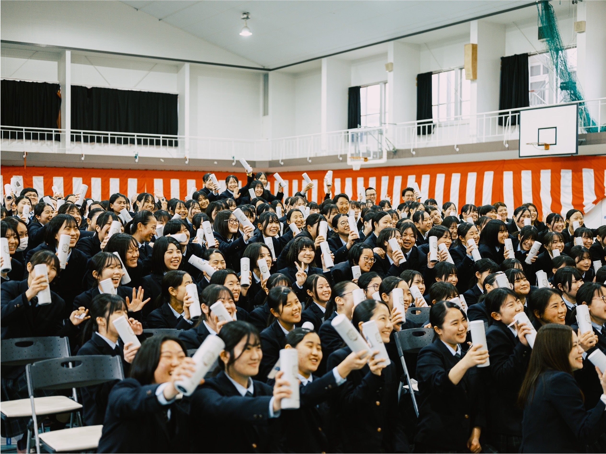 玉名女子高等学校の皆様、この度はご卒業おめでとうございます。本日のボトル贈呈式までの準備をする中で、ご応募いただいた先生方から生徒の皆様への多くの温もりある愛情に触れさせていただきました。これからの新生活、卒業生と先生お揃いのこのボトルを使うことで、大切な思い出とともに一歩進むきっかけになれば幸いです。