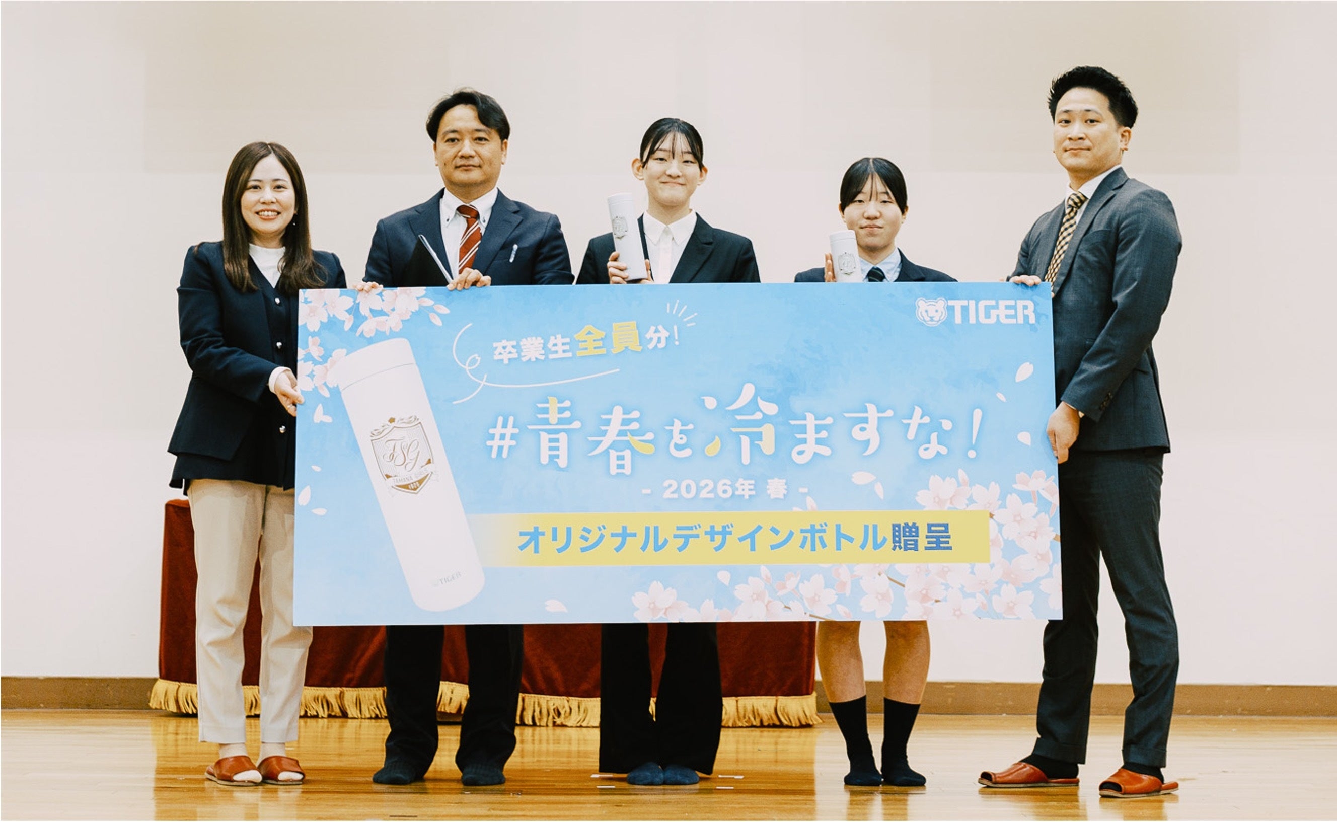当日は、「#青春を冷ますな!魔法瓶キャンペーン」の一環で、タイガー魔法瓶から、卒業生徒と先生たちへオリジナルデザインのボトルを人数分プレゼントしました。