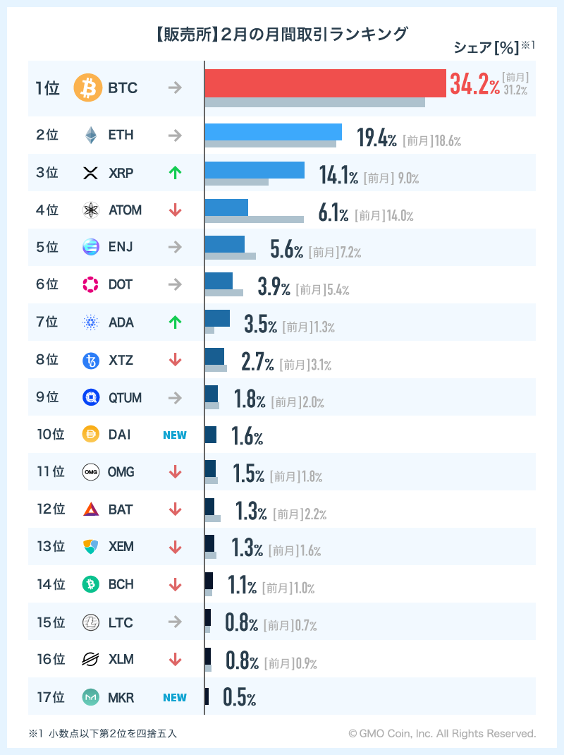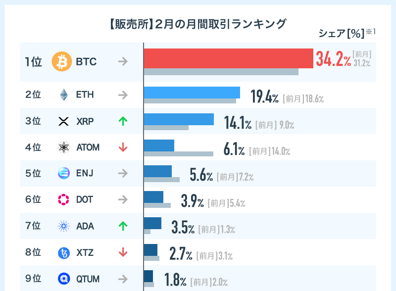「販売所」では、BTCがシェア34.2%で首位となりました。