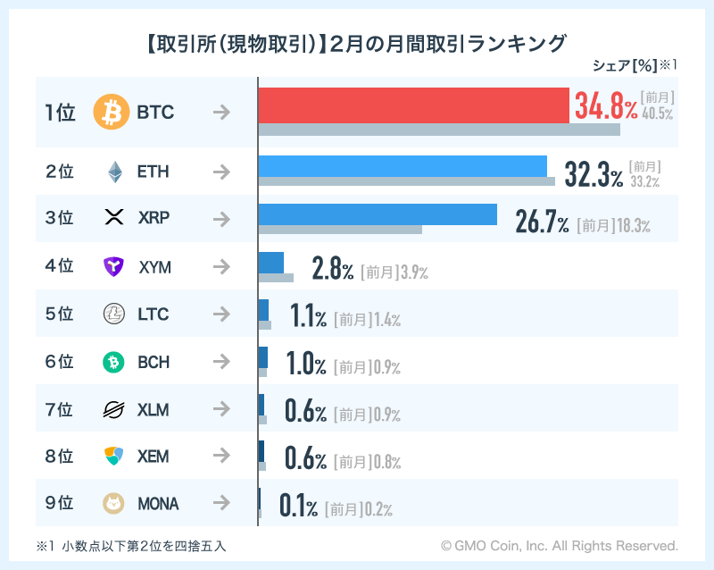 「取引所(現物取引)」では、BTCがシェア34.8%で首位となりました。