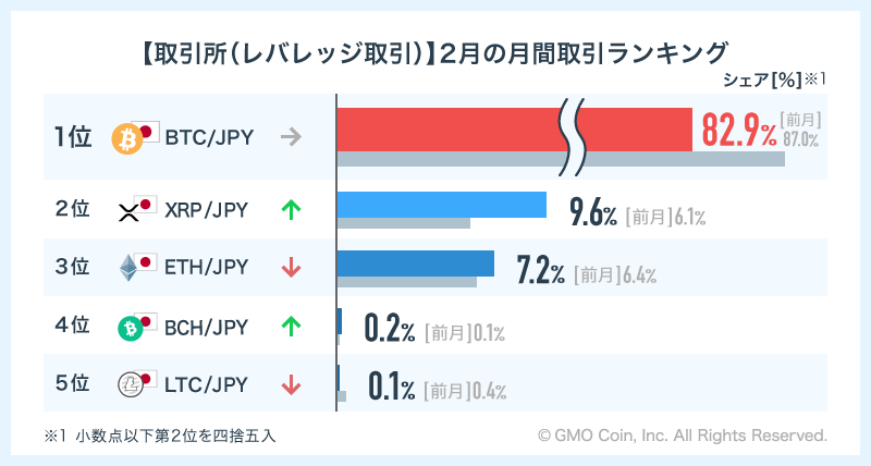 「取引所(レバレッジ取引)」では、BTC/JPYがシェア82.9%で首位となりました。