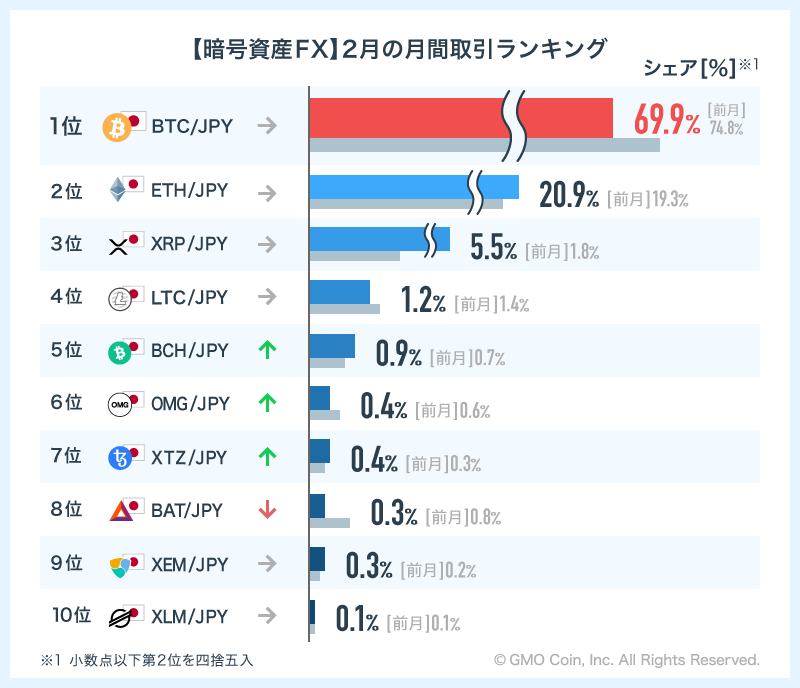 「暗号資産FX」では、BTC/JPYがシェア69.9%で首位となりました。