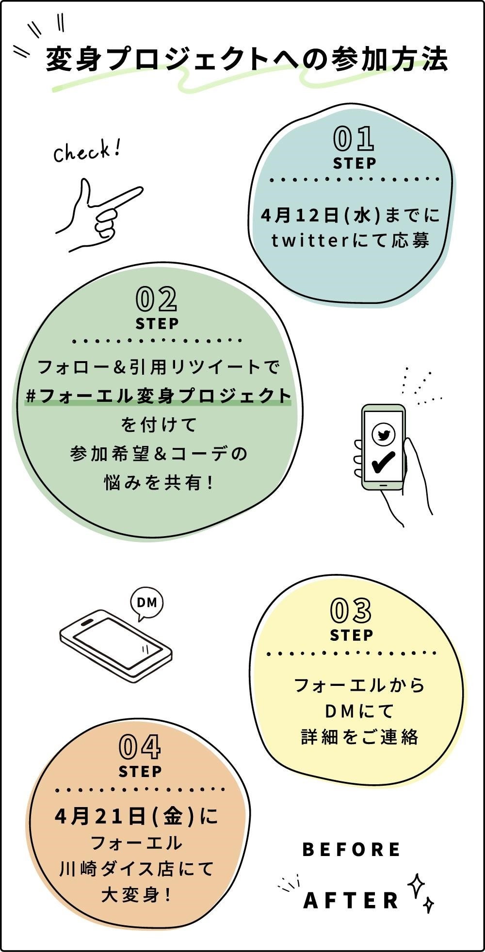 2023年4月4日(火)から開始する「#フォーエル変身プロジェクト」キャンペーンでは、Twitter上でファッションの悩みを募集するとともに、応募要項に沿ってキャンペーンツイートをリツイートしてくださった方の中から抽選で、4月21日(金)川崎ダイス店で実施する、全身コーデ提案会にご招待いたします。