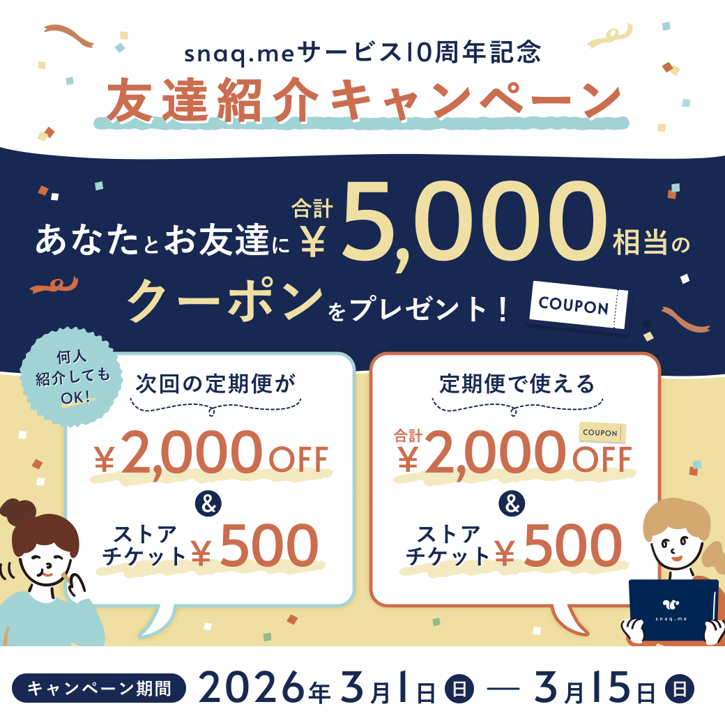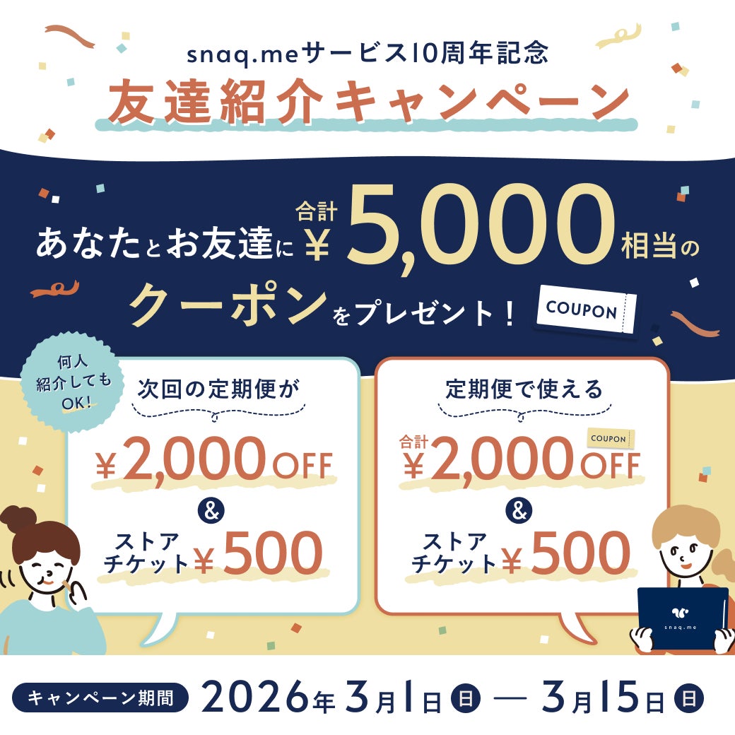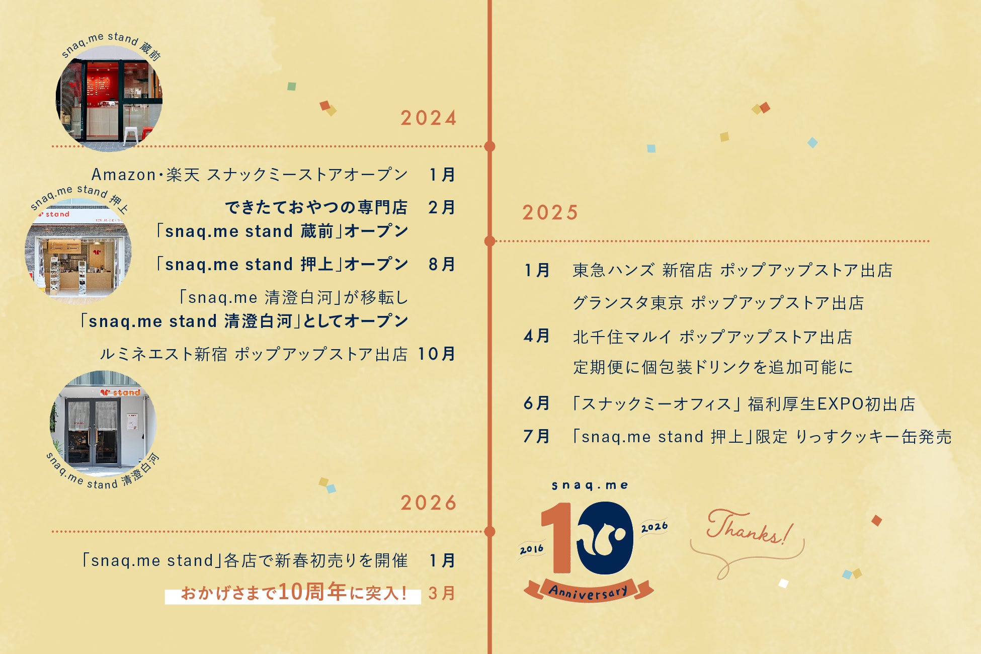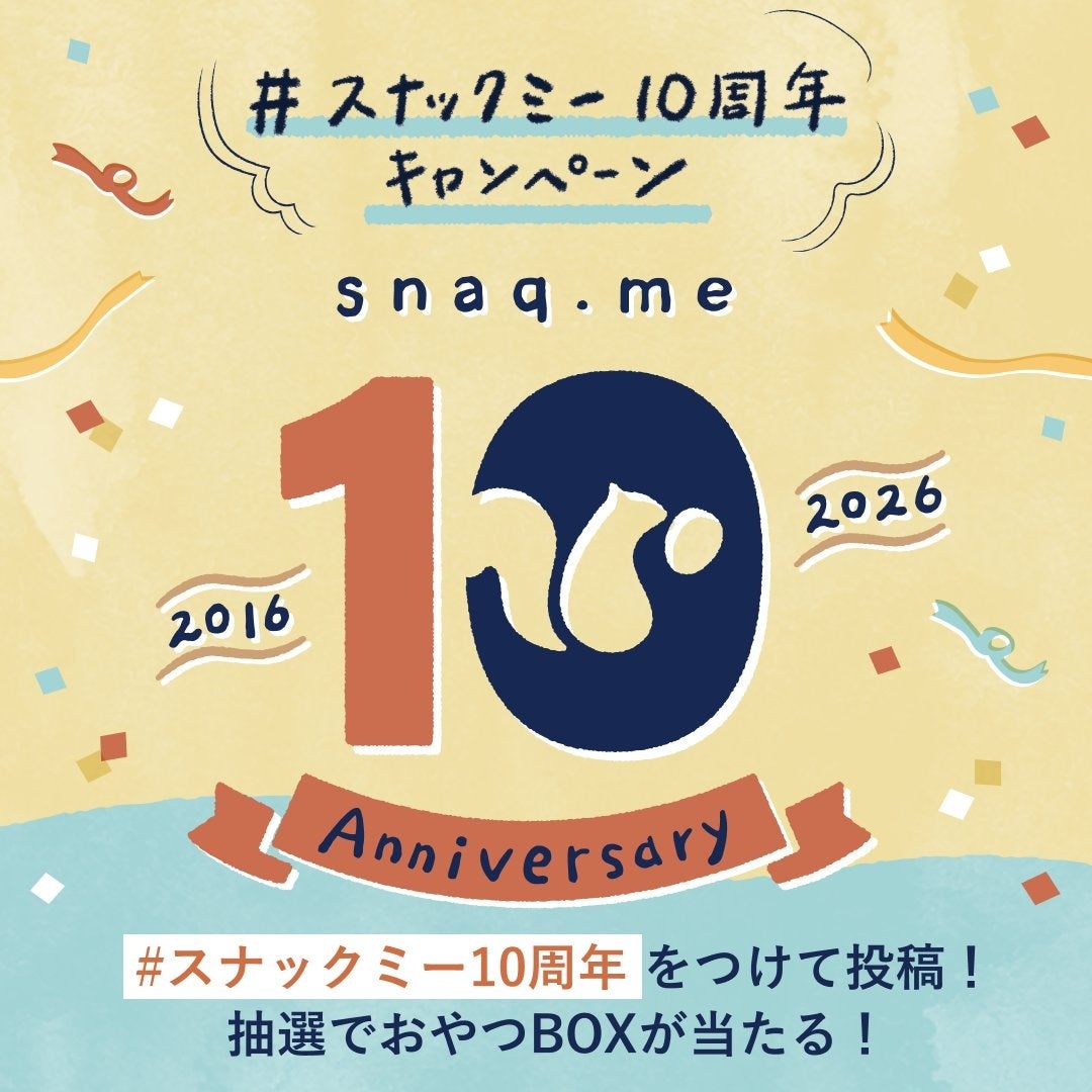 株式会社スナックミー(本社:東京都中央区 / 代表取締役:服部慎太郎)は、2026年3月におやつ体験BOX『snaq.me『スナックミー』」の正式リリースから10周年を迎えます。この節目を記念し、10年間で積み上げたデータと歩みを振り返るインフォグラフィックを公開いたします。