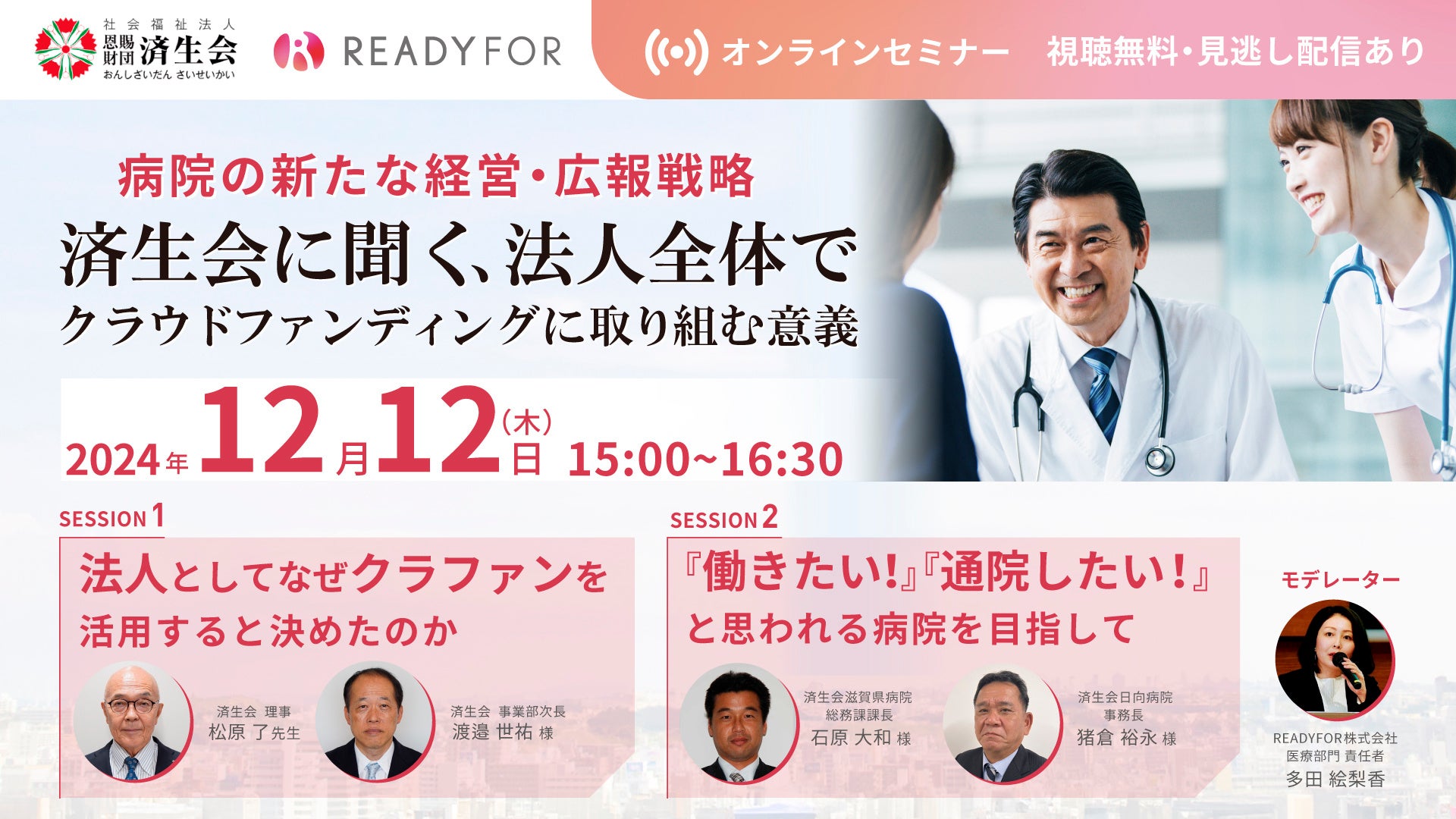 日本初・国内最大級のクラウドファンディングサービス「READYFOR」を運営するREADYFOR株式会社は、社会福祉法人恩賜財団済生会と共催で2024年12月12日(木)にオンラインセミナー「病院の新たな経営・広報戦略!済生会に聞く、法人全体でクラウドファンディングに取り組む意義」を開催いたします。