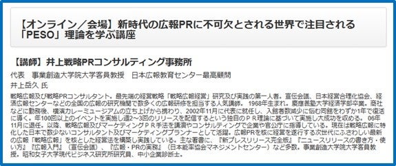 講座名: 新時代の広報PRに不可欠とされる世界で注目される「PESO」理論を学ぶ講座