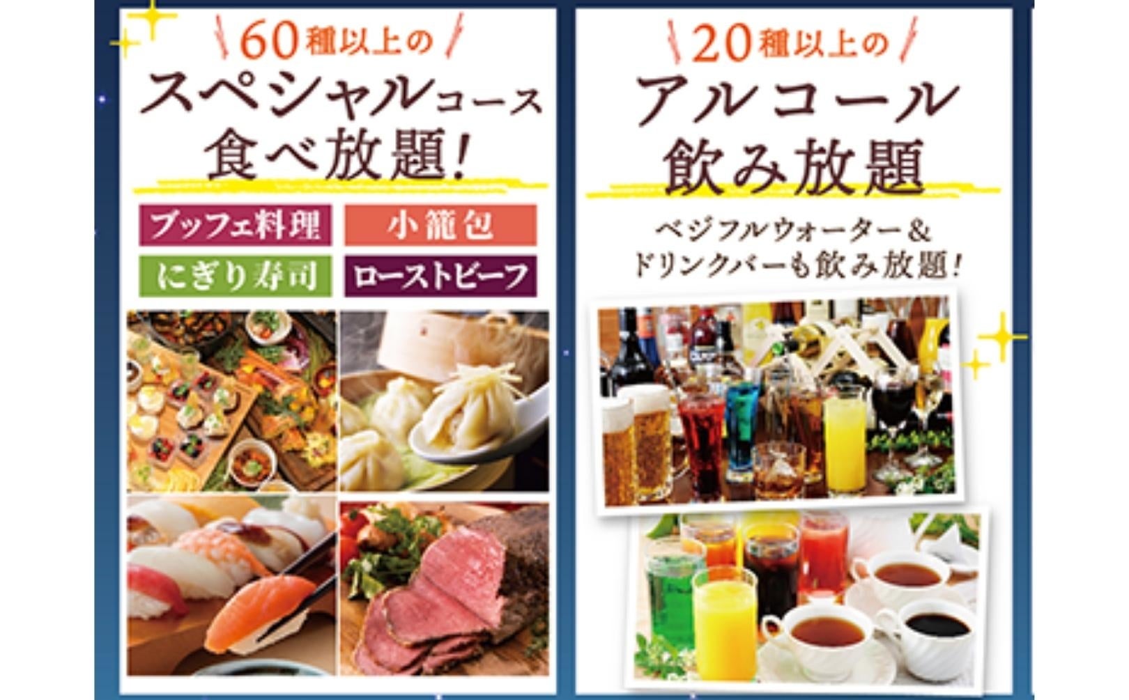 特別プランでは、生ビールやハイボール、樽生スパークリングワインなど20種以上のアルコール飲み放題に加え、低温調理でじっくりと焼き上げた『自家製ローストビーフ』や、人気のネタが堪能できる『握り寿司』、オーダーをいただいてから蒸したてをご提供する『自家製小籠包』などを中心に、バラエティー豊かな60種以上のお料理が食べ放題の充実したプランとなっております!