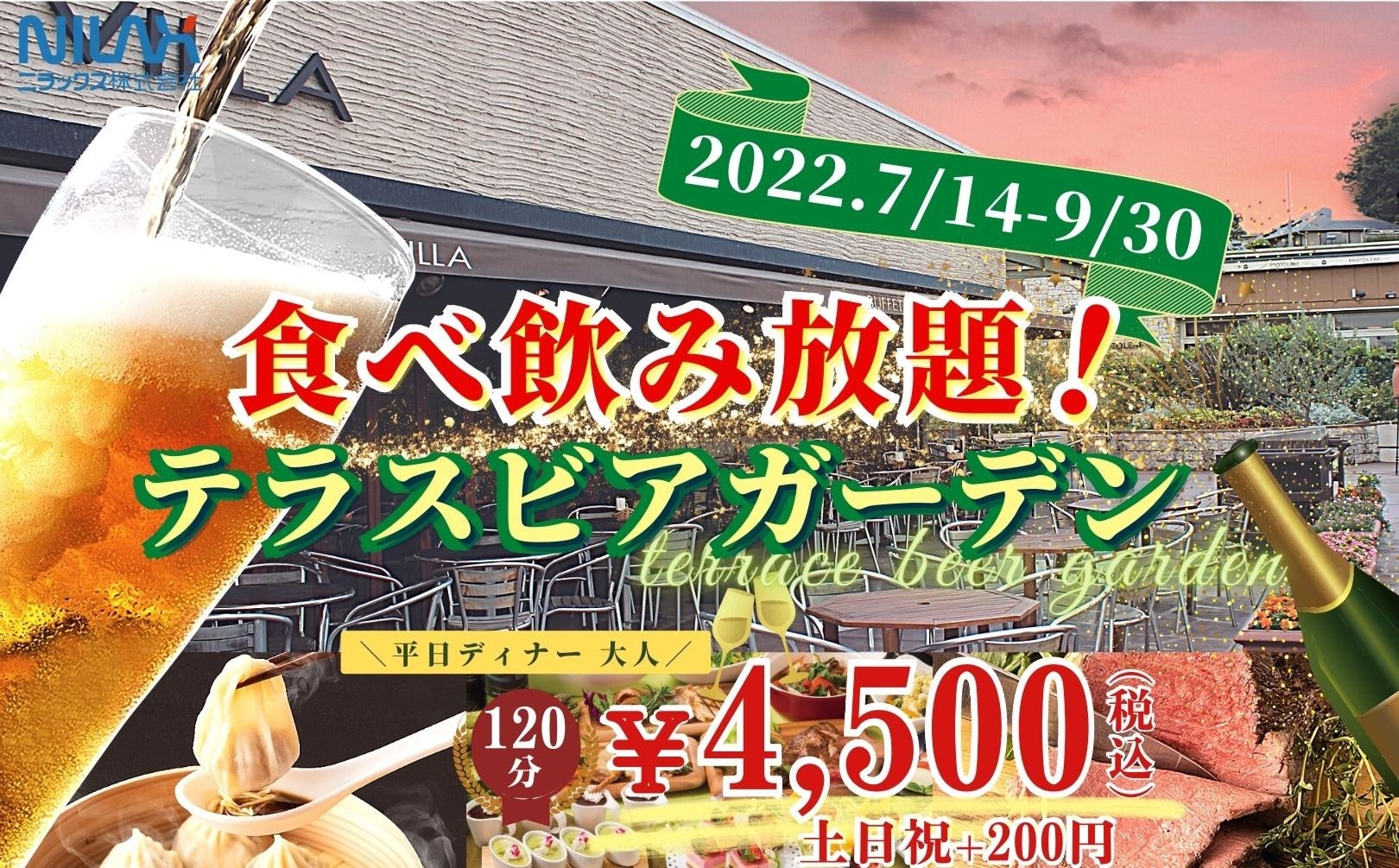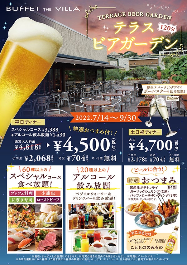 【ブッフェで満喫!ビアガーデン!】テラス席が人気の“ブッフェ ザ ヴィラ ”にてビアガーデン食べ放題プランが登場!120分アルコール飲み放題付きで平日ディナー4,500円!土日祝ディナー4,700円!