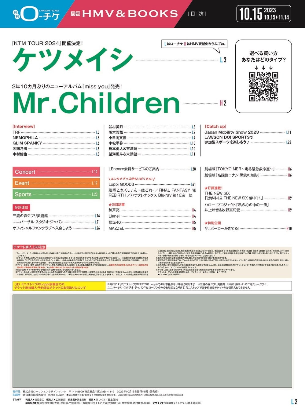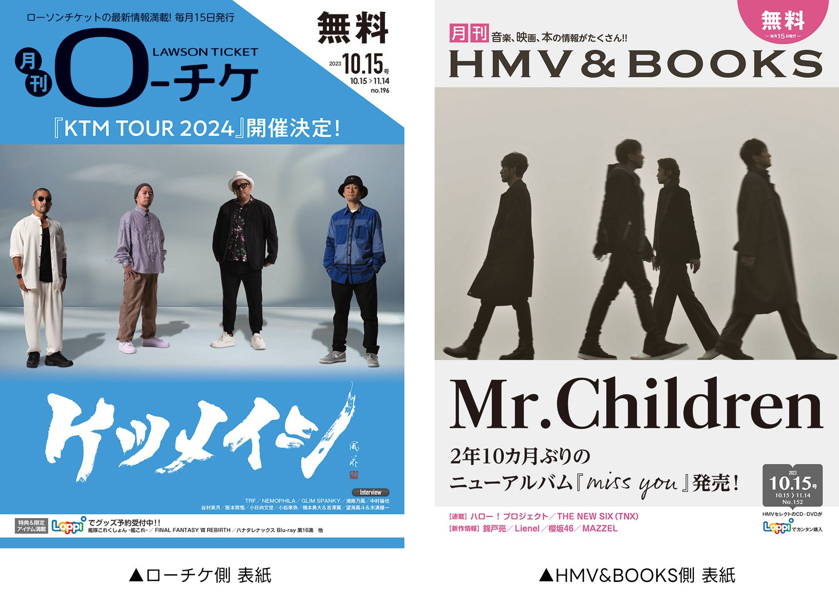 『月刊ローチケ』の表紙には、来年3月より全国11カ所を巡るアリーナツアー『KTM TOUR 2024』を開催する「ケツメイシ」。そして『月刊HMV&BOOKS』の表紙には、2年10カ月ぶりのニューアルバム『miss you』をリリースした「Mr.Children」が登場!