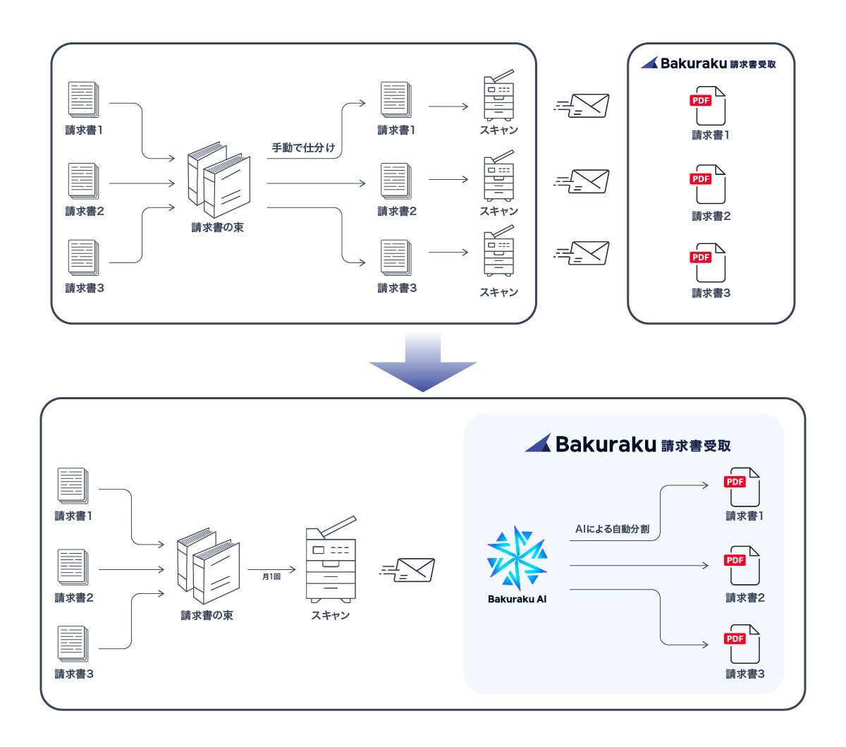 本機能によって、複合機などでスキャンした紙の請求書をまとめて「バクラク請求書受取」に取り込むと、AIが自動で書類の分割箇所を推薦してくれるため、AIの推薦箇所を確認するだけで処理が完了します。今まで紙で受領した請求書を手動で仕分けし、請求書ごとに取り込んでいた手間が削減されます。