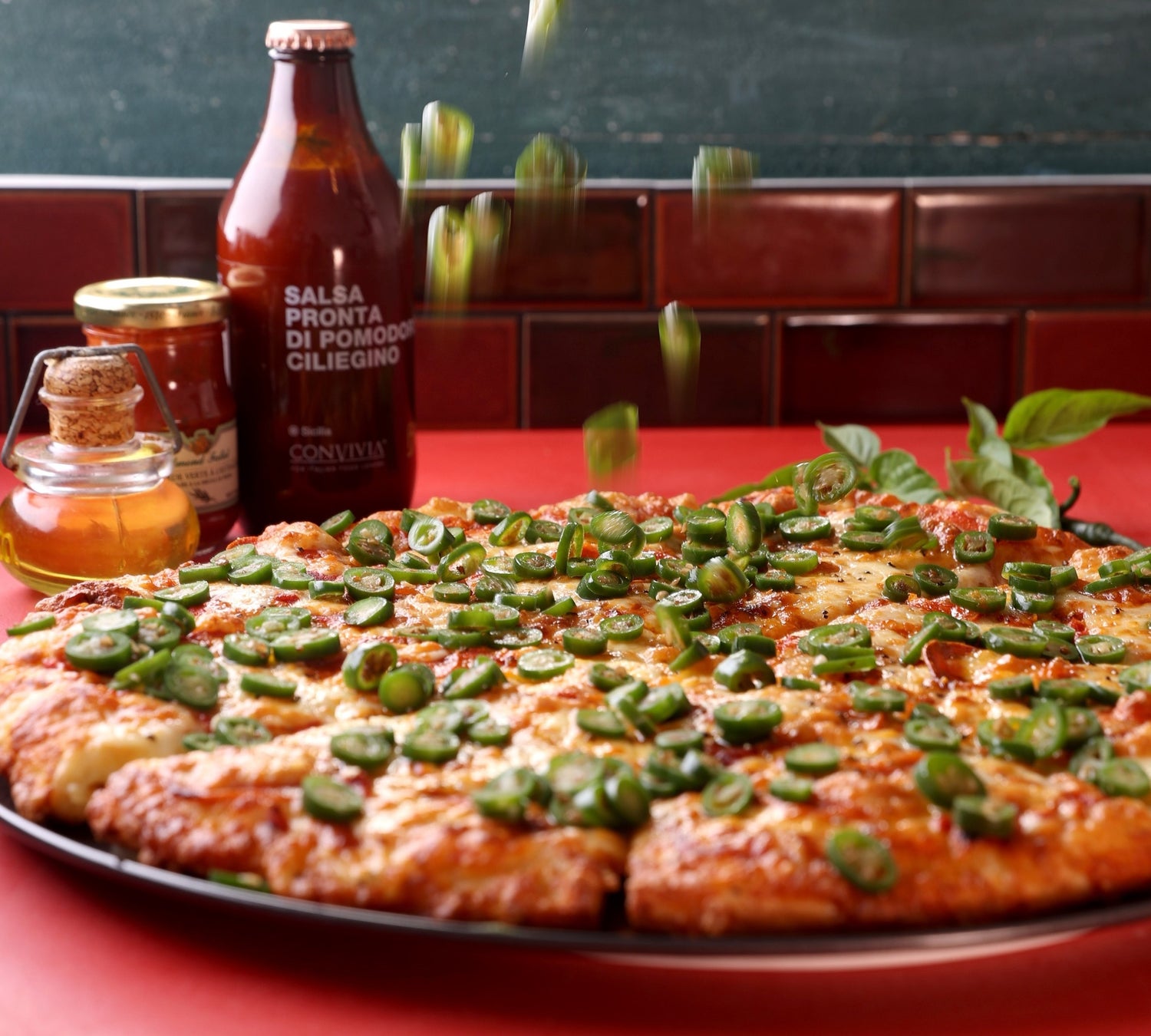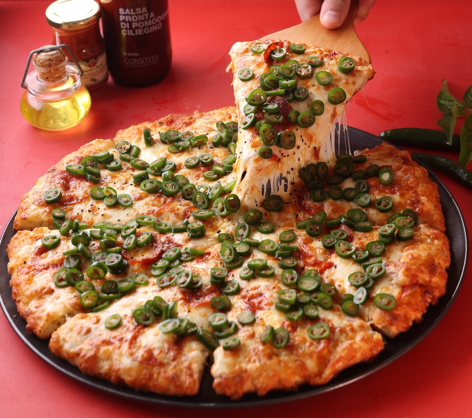 突き抜けるような爽やかな辛さが特徴的な唐辛子「セラーノペッパー」を使用した期間限定の『ピザーラ セラーノペッパー』は、ピザをオーブンで焼き上げた後に、カットしたセラーノペッパーを乗せた、フレッシュな風味と辛さが楽しめる一枚です。