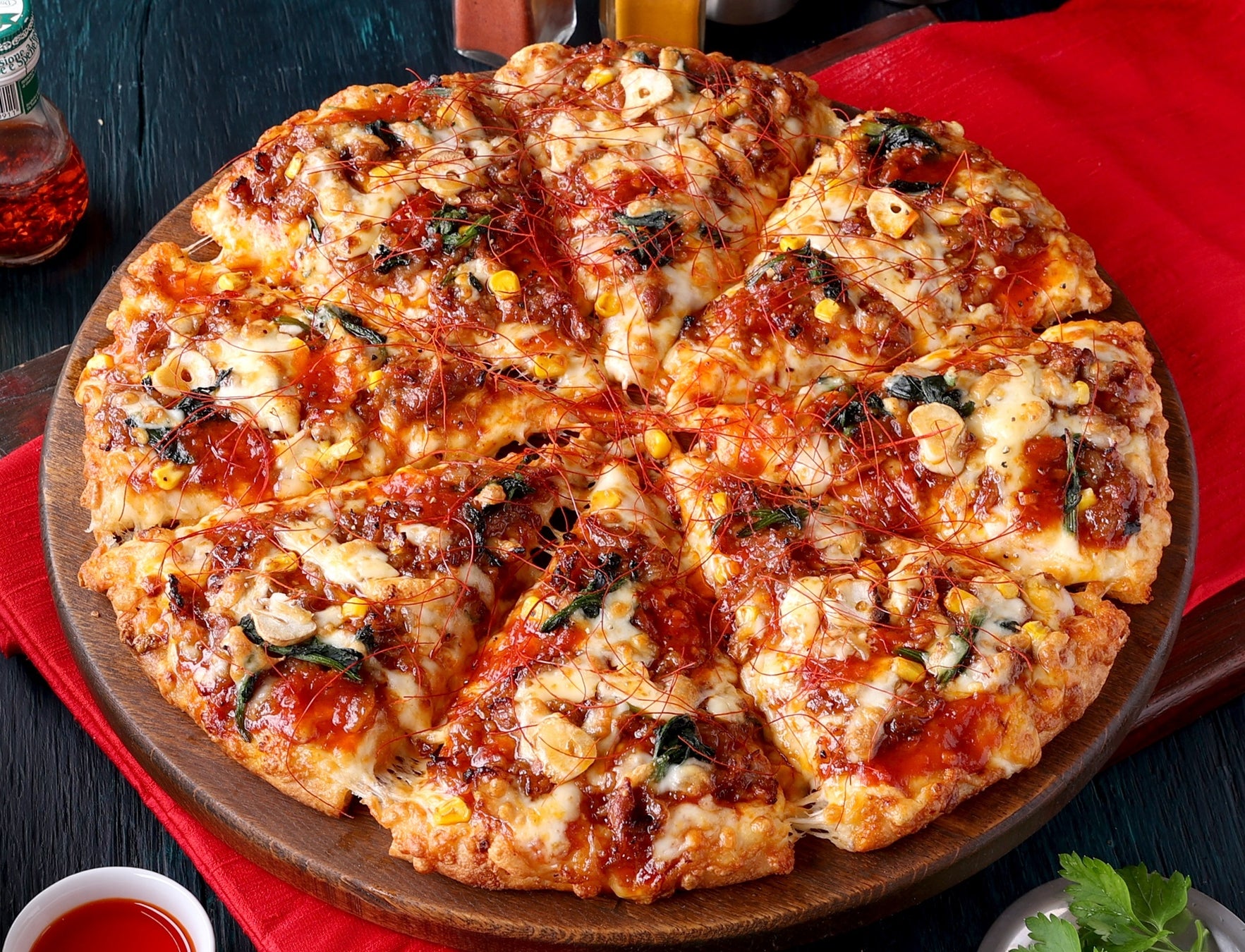 醤油やコチュジャン、ハチミツなど14種類の調味料やスパイスで味付けした特製のプルコギや、香ばしく食欲をそそるスライスガーリック。フレッシュなオニオン、食感楽しいコーンなど、ふんだんにトッピングした食材が一体となり、旨み・香り・食感が楽しめる一枚です。味の決め手となるソースはトマトベースに唐辛子などで辛みを加えた「旨辛ホットソース」。さらに別添えの「特製スパイシーオイル」は、唐辛子、ニンニク、クミンなど6種類の香辛料を配合したピザーラ特製オイルで、お好みでかけていただくと味変がお楽しみいただけます。