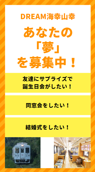 貸し切りのD&S列車「海幸山幸」でやってみたいことや実現したい「夢」を下記のフォームからご応募ください。抽選の中から選ばれた一組の「夢」を叶えるためにD&S列車「海幸山幸」を丸ごとお貸しします。