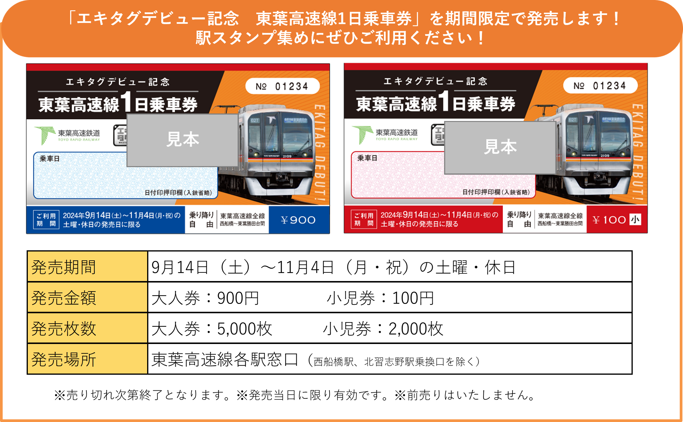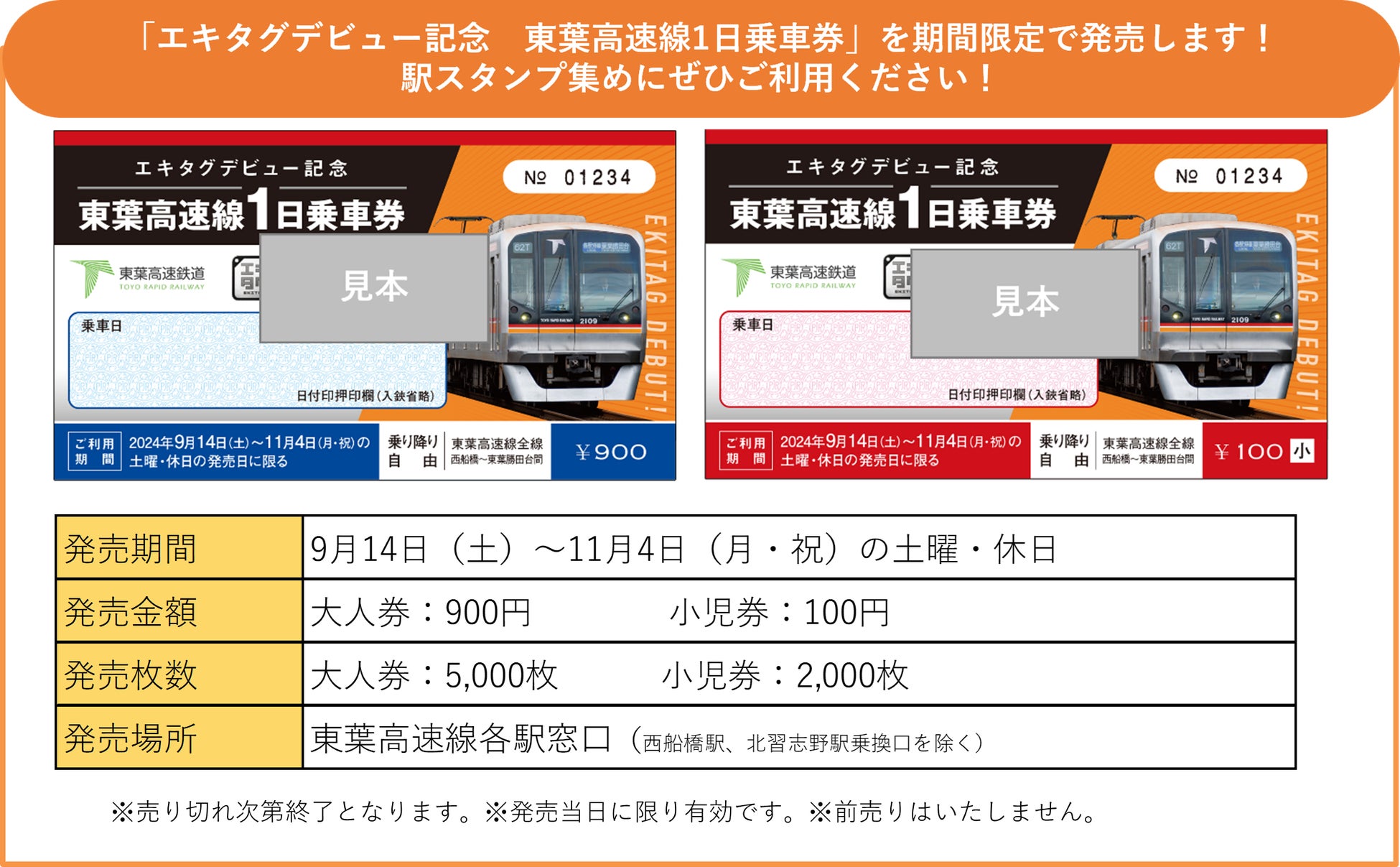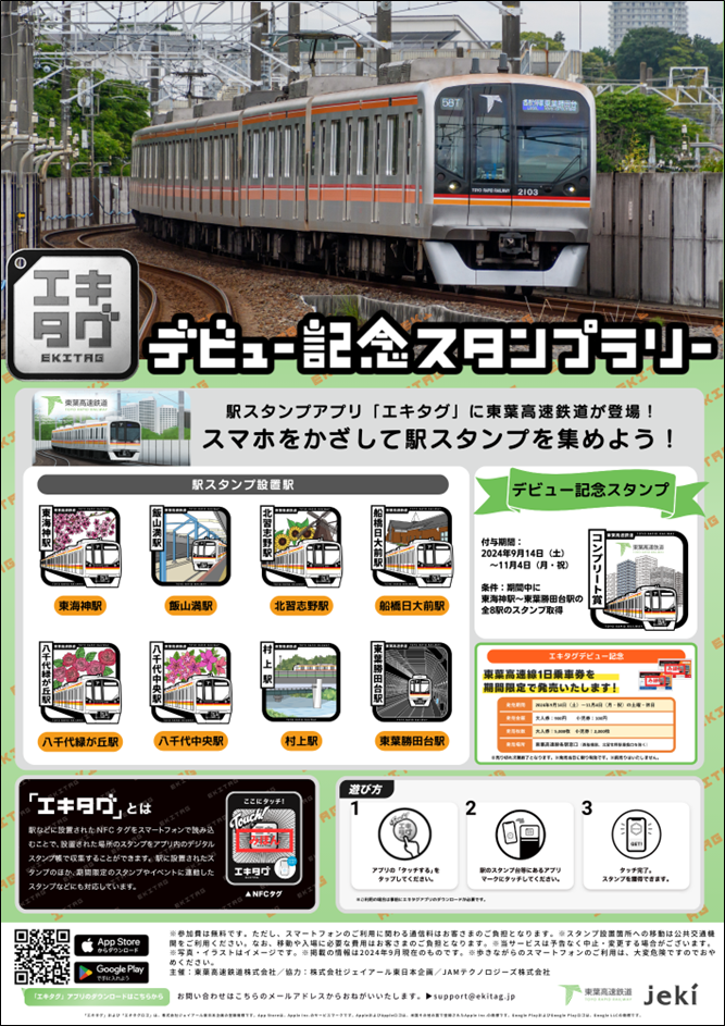 ◎株式会社ジェイアール東日本企画が提供する駅スタンプアプリ「エキタグ」では、2024年9月14日(土)より、千葉県エリアの東葉高速鉄道にエキタグがデビューします。また、エキタグデビューを記念し、期間限定で全駅達成の限定スタンプをプレゼントするスタンプラリーを開催します。 ◎2024年9月28日(土)に開催される「東葉車両基地まつり」において、東葉高速鉄道オリジナルのクリアファイルがもらえる「東葉車両基地まつりスタンプラリー」を開催します。ぜひこの機会に東葉高速鉄道のエキタグスタンプをお集めください! |