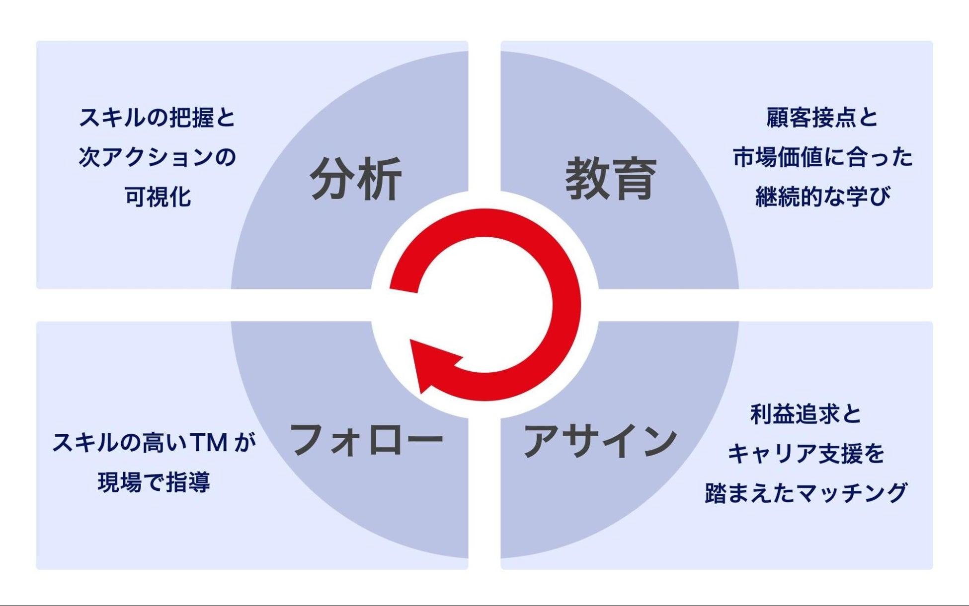 上記で明確にした目標をもとに、創業から20年以上「人財育成会社」として多くのエンジニアを輩出してきた当社の教育制度を用いて、エンジニアのリスキリングを促します。顧客接点を持ち、市場価値にあった継続的な学びを支援します。