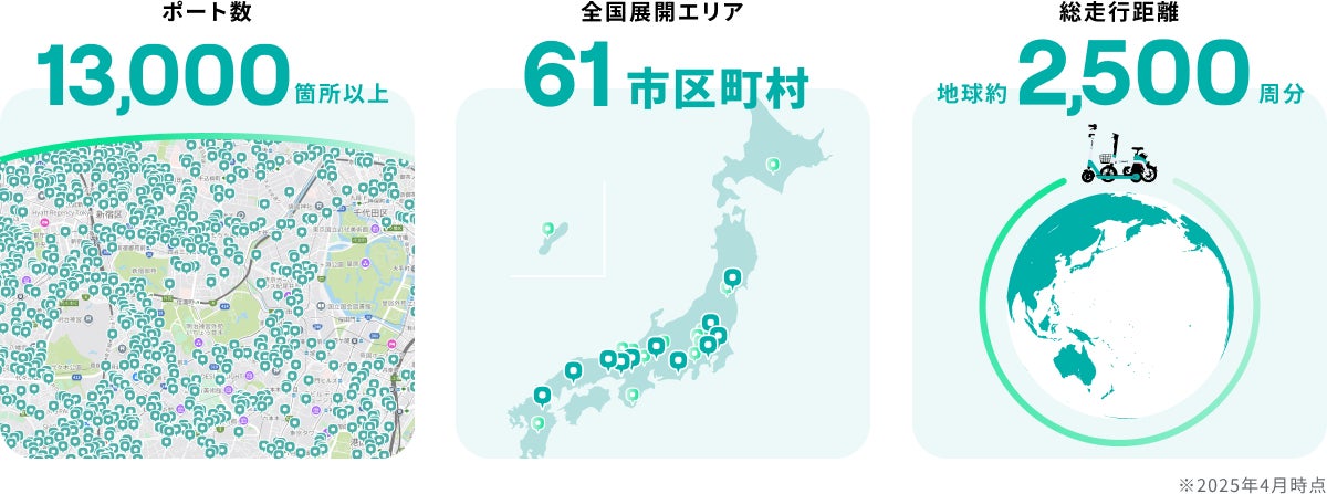 現在、LUUPは全国に13,000箇所以上のポートを導入し、国内No.1の電動マイクロモビリティのシェアリングサービス(※)に成長しました。各展開エリアにて、通勤、通学、買い物、お出かけ、観光など、様々なシーンで日常の移動手段としてご利用いただいています。アプリダウンロード数は450万を超え、この5年間でLUUPをご利用いただいた距離を合算すると1億km以上となり、これは地球約2,500周分に相当します。