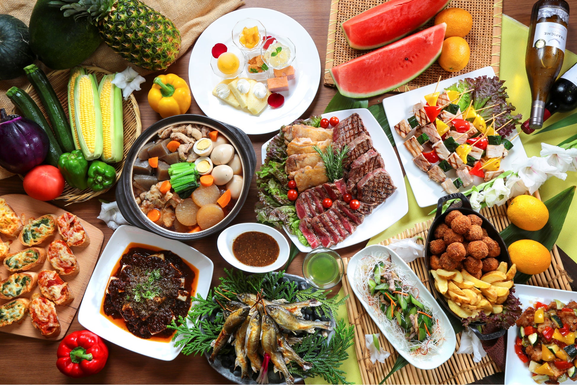 ブッフェ料理は、第1弾の「チキンステーキ」、「カツオのたたき」などに加えて、香ばしい焼き色が食欲をそそる「鮎の塩焼き」、玉子でふんわり綴じた出汁と穴子がぴったりの「穴子柳川風」の他、4種類ずつの期間限定入れ替えメニューも登場。7月16日から8月31日は「麻婆豆腐」と「豚バラと野菜の串焼き」など、9月1日から30日は、「キムチ肉じゃが」と「バターチキンカレー」など、リピートでも楽しめるメニューと、デザートにはもちもちした独特な食感が特徴の「マンゴ氷菓」などをご用意いたします。