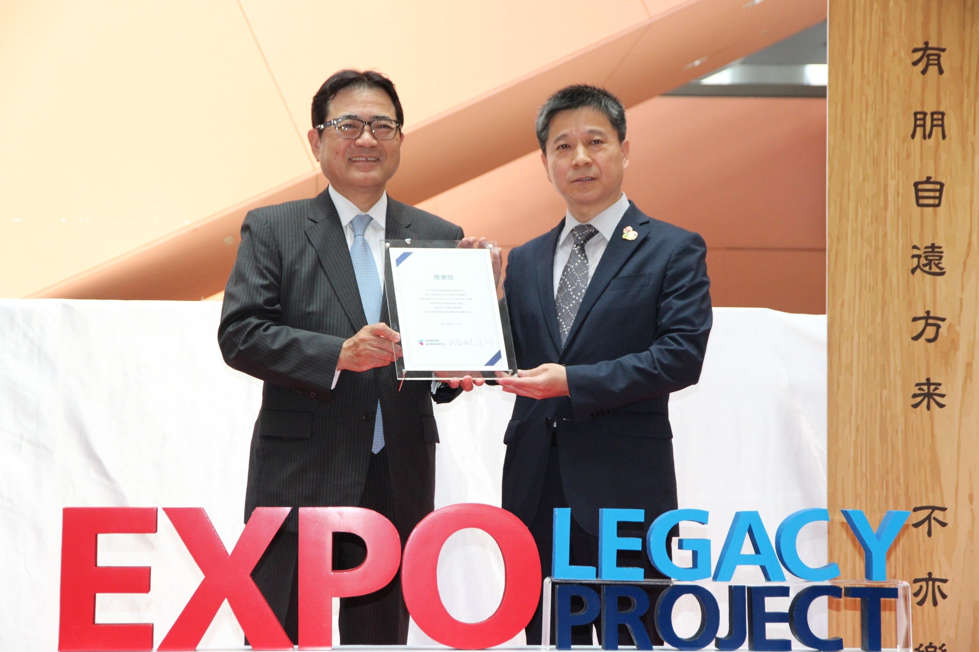 中国と大阪・関西地域は、これまでも経済、文化、学術など多岐にわたる分野で深い関係を築いてきました。関西国際空港は、まさにこの論語の言葉が表すように、長年にわたり多くの中国からのお客様を迎え入れ、交流の玄関口としての役割を果たしてきました。万博という国際的な舞台で生まれた友好の証が空港に展示されることで、これから空港を訪れる国内外の方々にも万博で育まれた交流の物語を感じていただきたい、大阪・関西地域全体で中国からのお客様に歓迎の意を伝えたいという気持ちをこめています。