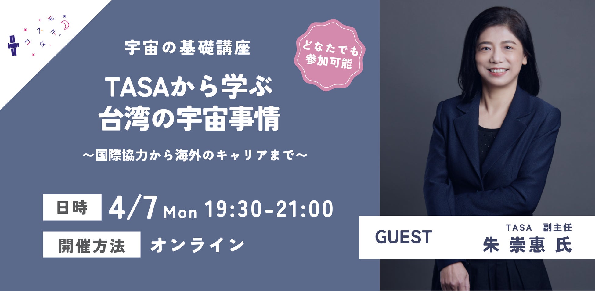 株式会社Kanatta(代表:井口恵)が運営する「コスモ女子」は、4月7日(月)にTASAの要職である副主任を務める朱崇惠氏をお迎えし、台湾における宇宙開発や国際協力について学ぶイベントを開催します。