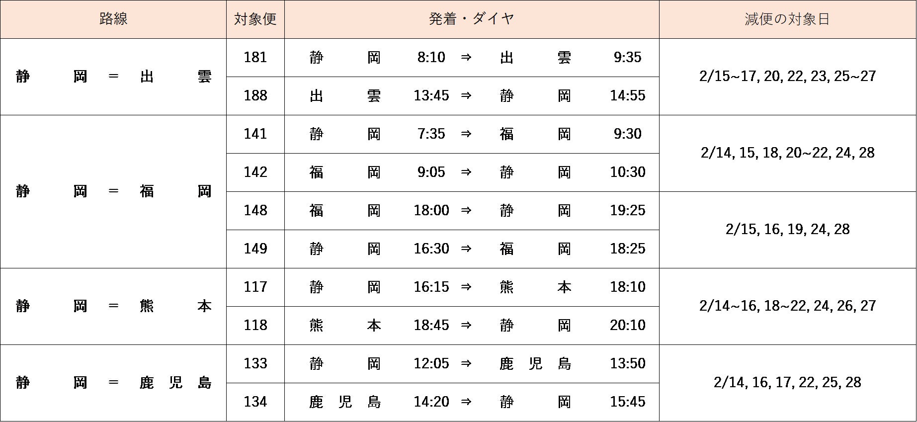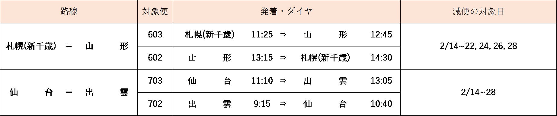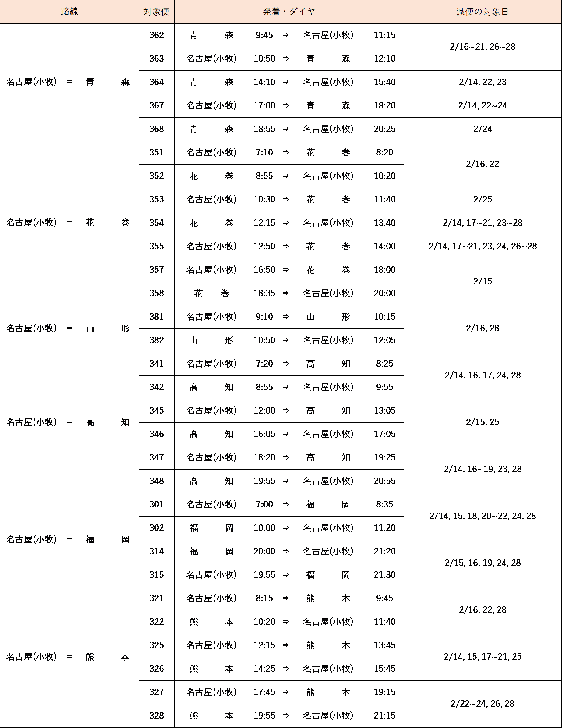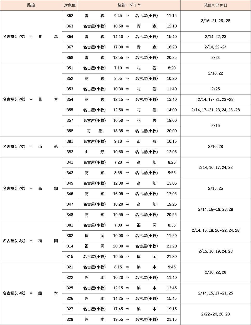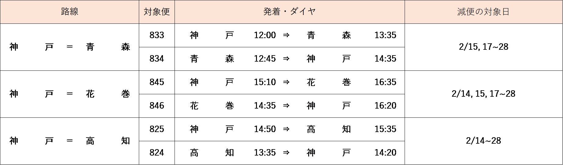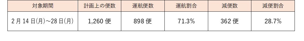 【2月14日(月)~28日(月)の運航路線・便について】
